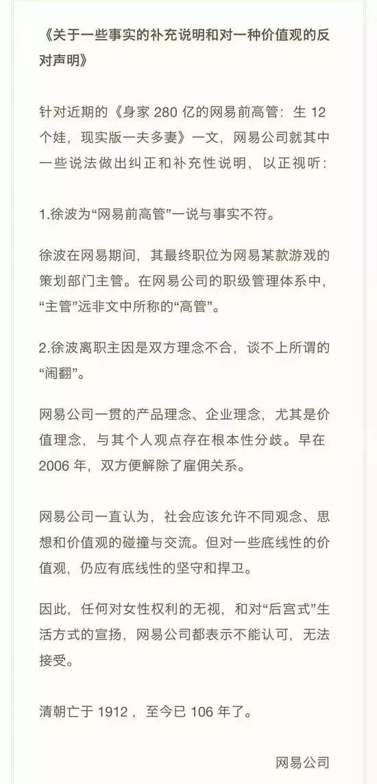 针对近期的《身家280亿的网易前高管:生12个娃,现实版一夫多妻》一文,网易公司就其中一些说法做出纠正和补充性说明,以正视听: