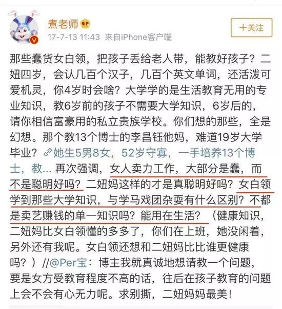 先简单介绍一下这篇文章内容,大致是介绍了一位在微博上叫@煮老师 的“前网易高管”(此说法存疑,后网易回应里有解释)以自己为例,大肆宣扬了已被废除的封建社会一夫多妻制,并洋洋自得自己身价280亿,自有无数女人愿意不记名分给自己生孩子。而他的生活俨然一派皇权时代景象,正宫偏房一个不差且各自安好,他宣扬的观念也是“女子无才便是德”,并讽刺现代女性在外工作挣钱,让老人帮忙照顾孩子是“蠢”。对于婚姻与爱情,他一方面严格要求自己另一半“不能单独与异性吃饭”,另一方面又强调自己博爱,只爱年轻女性。