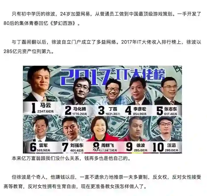 日前,一篇《身家280亿的网易前高管:生12个娃,现实版一夫多妻》的文章在近期让观者为之惊掉下巴,闻者为之满脸黑线,严重怀疑文中主人公是不是精神失常。