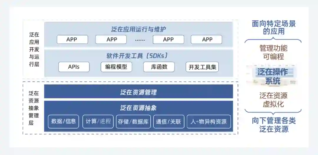 泛在操作系统是传统操作系统概念的进一步扩展与泛化,不再把操作系统的概念局限于像 Linux 和 Windows 这样的单机操作系统。因此,泛在操作系统的形式更加灵活、多样,更多的强调操作系统的“操作”和管理的功能本质,支持灵活多样的资源虚拟化机制与异构资源管理功能,侧重于新型应用模式下的应用开发与管理支撑。