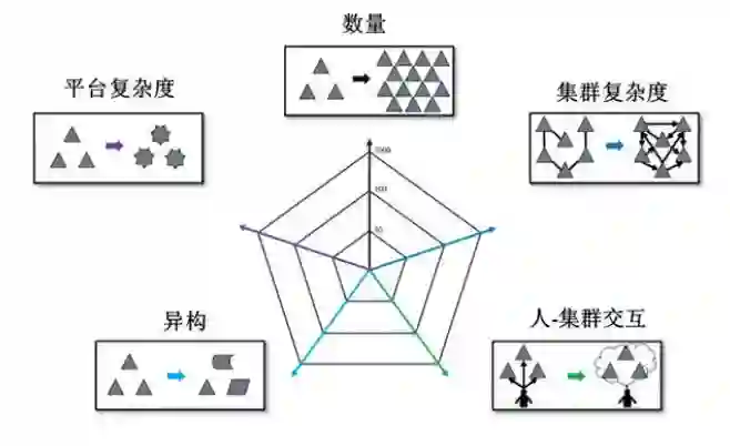 在现有的多机协同基础上,无人机自主集群系统日益复杂(图 5)。在成员数量方面,无人机集群系统将从传统多机协同中的数架无人机拓展至几十架甚至是成百上千架无人机。在平台自主水平方面,无人机集群系统将从仅可执行侦察监视等简单任务发展到可完成非结构化环境下的复杂对抗性任务。在平台异构性方面,无人机集群系统将从单一的平台载荷发展到多任务领域下的异构平台和载荷。在集群复杂度方面,无人机集群系统将从简单的领导者/跟随者的交互发展到自组织、分布式自主协作。在人-集群交互模式方面,无人机集群系统将从简单的遥控模式发展到人-集群智能交互模式。具体来说,无人机自主集群系统具有如下发展趋势。