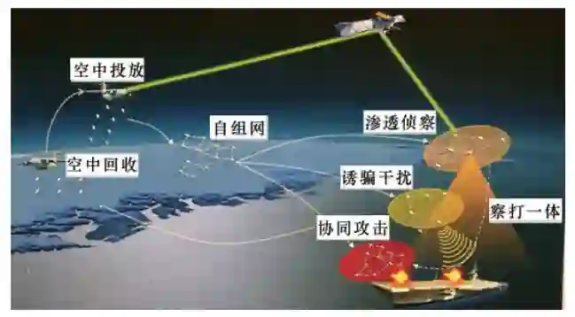 2)诱骗干扰:采用无人机集群充当诱饵或干扰机,替代隐身轰炸机或战斗机直接进入战场的传统作战方式,可引诱敌方防空探测设备开机工作从而暴露阵位,消耗敌方防空兵器;此外,可携带电子干扰设备,对敌方预警雷达、制导武器等进行更加抵近的电子干扰压制欺骗。