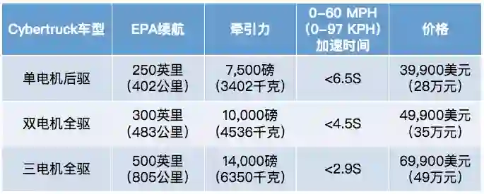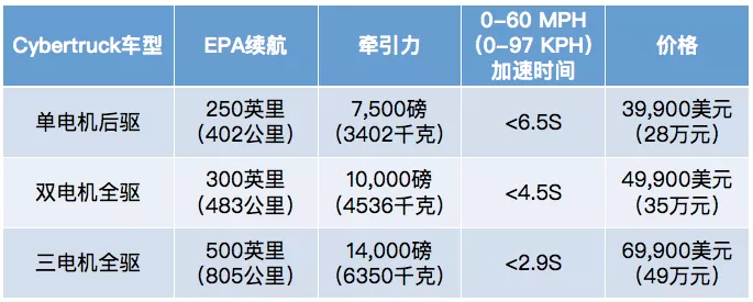 特斯拉Cybertruck首次亮相于2019年,该款车原计划有3种动力系统可供选择:单引擎后轮驱动版本,双引擎全轮驱动版本和三引擎全轮驱动版本。