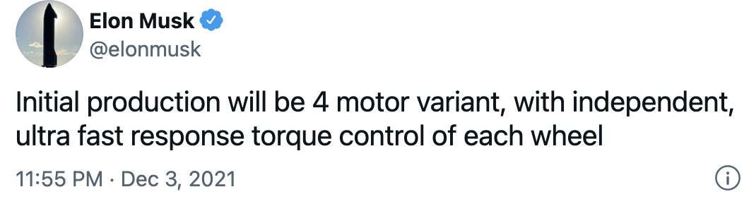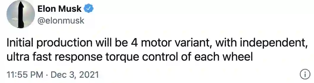据悉,四电机版本的Cybertruck将有四个独立的控制电机连接到每个轮子,就像