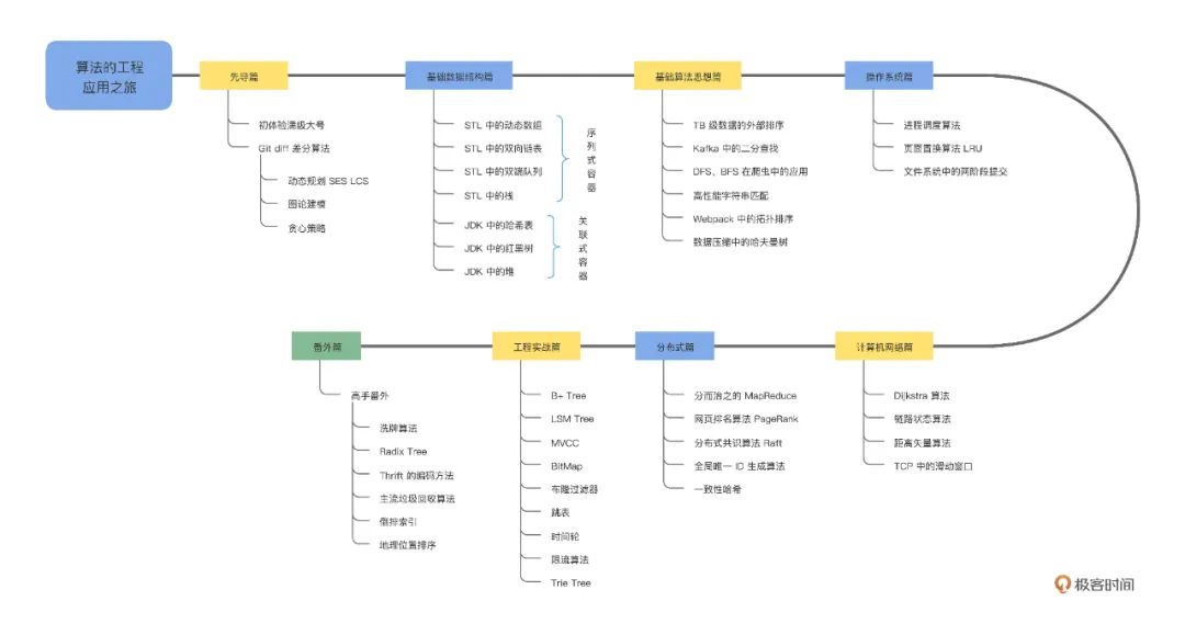 网上资料不少,大多讲的理论,不结合实际问题,不考虑工作场景,还是学不会。最近看到极客时间上了个《算法实战高手课》专栏,还是让我眼前一亮的,点题就是「实战」,我第一时间就订阅了,看了更新的几篇,可以说是从实际工程问题的视角,真真切切的为大家呈现了一堂实用的算法课,分享一张专栏中「核心算法应用图」。