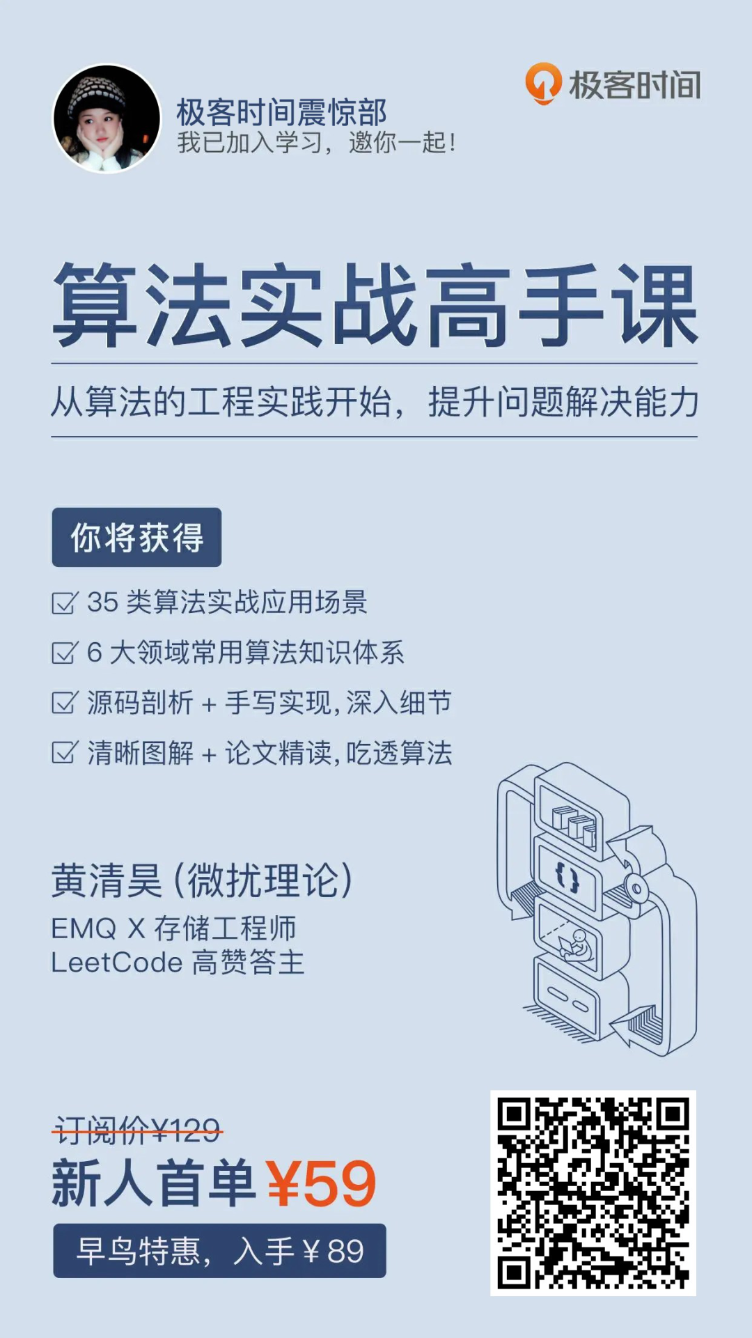 这个专栏是从算法的工程实践开始,着重讲算法是如何运行在真实的物理机器上的,如何解决实际业务系统中的问题的,如何在各个稳定运行的中间件、分布式系统、基础库中实现的。再加上源码剖析,手写实现,深入细节,带你掌握 35 类算法实战应用场景、6 大领域常用算法知识体系,真正提升你解决问题的能力。