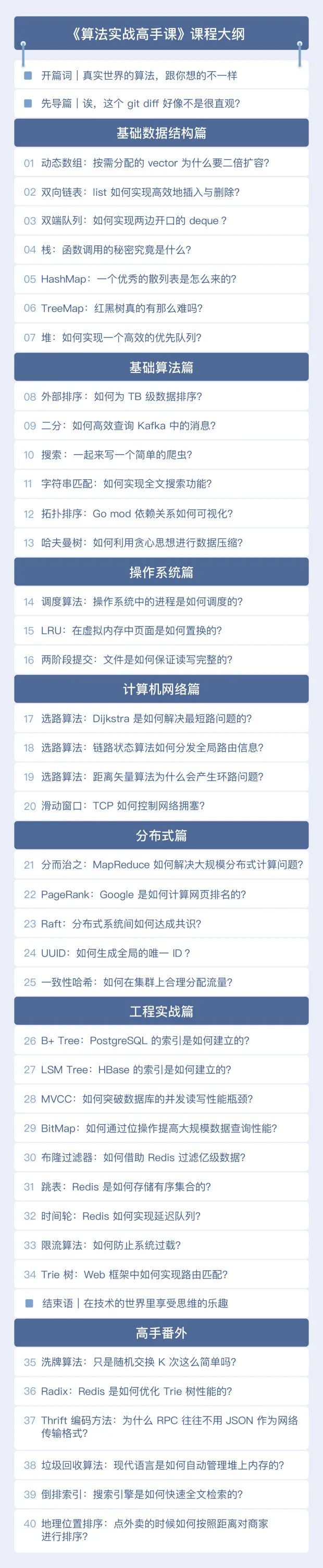 专栏主题是真实世界的算法、工程中的算法。主要分为基础和实战两部分,共 6 个篇章: