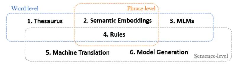 这类方法根据替换的成分不同,又可以分为词、短语、句子级别。作者共总结了6种方法:
