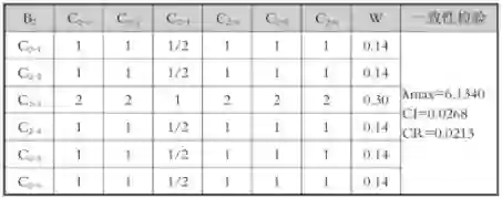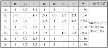 采用同样的方法,首先根据矩阵B的数值,得到二级指标的W0值;接着,算出W的归一化值;然后,形成二级指标 B1,B2,...,B7 的权重。