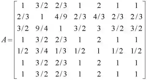 将“雨课堂”等智慧教学模式的特征指标进行多级化处理,并将特征指标数值赋值于矩阵形式。一级矩阵(准则层)共为1组(矩阵A),即互动性行为数值矩阵。它表示“学习资源数量类”等7类合成因子的重要性属性的比值关系。通过以 “学习资源数量类”为基准,其它一级指标与其相除,得出一级矩阵的全部数值结果,如下所示: