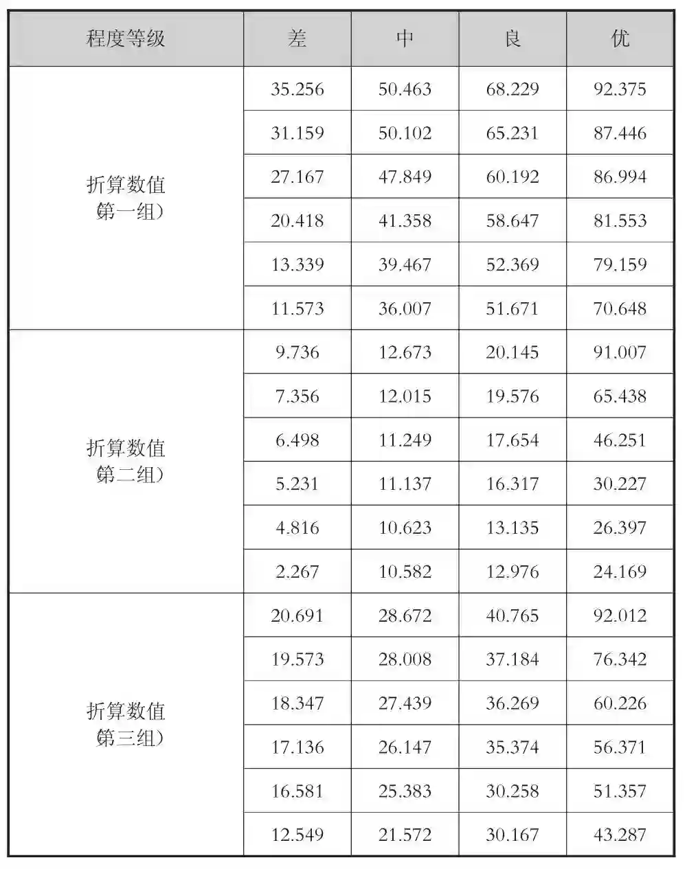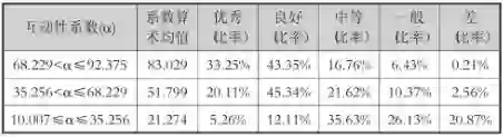在计算出师生间互动行为的互动性系数之后,再将其作标准化百分制折算,进而得出0-100之间相应数值的数组形式。这里参照何晓群、刘文卿在《应用回归分析》一书中采用的分位数法模式,将互动性系数折算值对应的程度等级,依次定义为优、良、中与差4个等级。各组程度等级及部分对应数值,如表6所示。