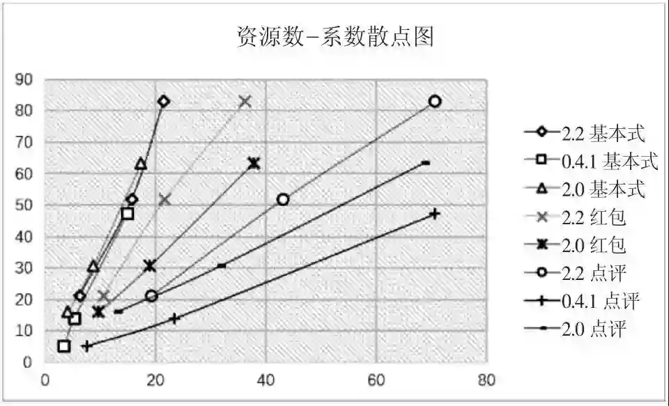 注:横坐标为资源数;纵坐标为互动性系数均值。2.2基本式,即“雨课堂”V2.2的基本要素式资源数与互动性系数均值的函数平滑线,其他类似;“翻转课堂”V0.4.1无红包激励项,故没有平滑线显示。