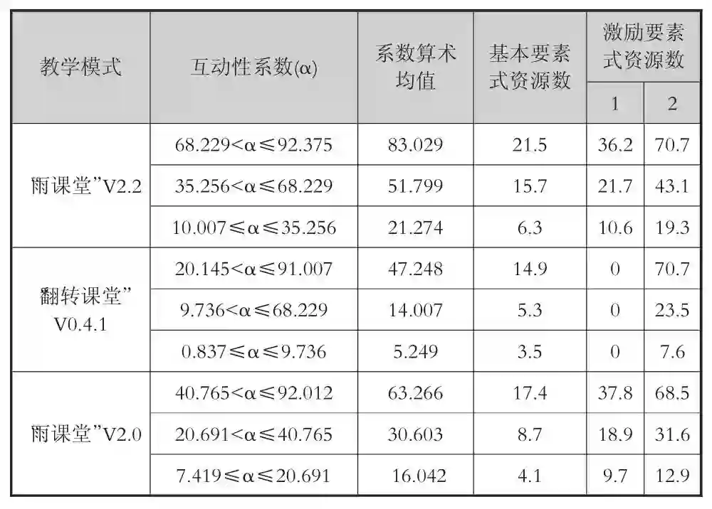 从微观数值层面深度解析,上述逻辑关系可得到以下更有说服力的客观数据支撑:以 “雨课堂”V2.2数据为样本,当互动性系数算术均值为83.029(系数值为:68.229<α≤92.375)时,任课教师分享的慕课、微课、网络视频等基本要素式在线教学资源数均值是21.5(每门课×学期×班级);课堂红包、点评数等激励要素式资源数则分别是36.2个和70.7个。“雨课堂”V2.2其余组位对应的数值、“翻转课堂”V0.4.1及“雨课堂”V2.0的相关佐证数据,经统一归集,如表8所示。
