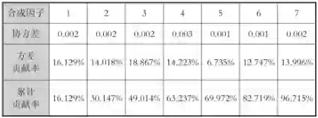 表2中协方差、方差贡献率及累计贡献率等相关数值显示:(1)7类合成因子累计贡献了原始特征指标96.715%的信息和能量,表明完整性比率较高;(2)协方差的数值均较小,反映了自身结构简洁、含义清晰、信息简明的特征;(3)协方差数值也反映合成因子间的重叠成分较少,相互影响效应较小。由此可见,IDCNN法所确定的合成因子,满足实证研究中的三个基本要求。