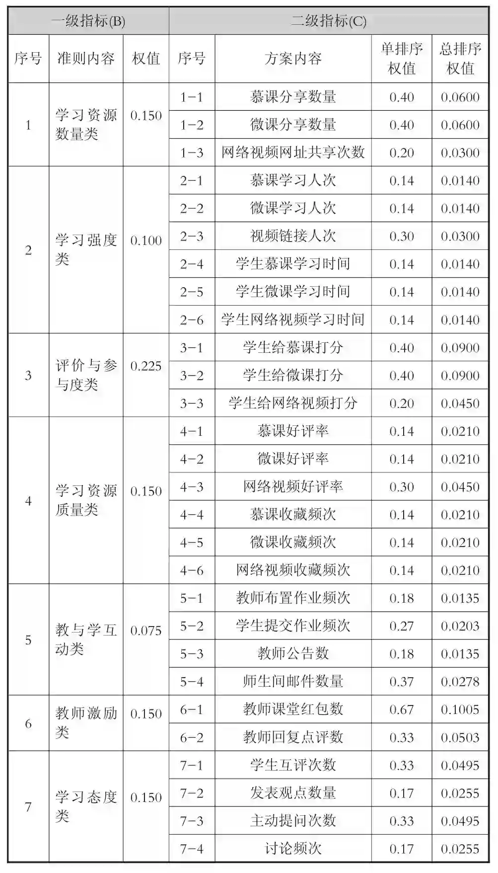 我们通过对各层次权重及具体互动行为特征的综合运算,并进行归一化处理后,得到师生间互动性行为的权重模型(表5)。为方便起见,模型中省略了第一层次的目标层(A层)。因此,准则层为7个一级指标(B层);措施层则由28个二级指标(C层)构成,具体如表5所示。