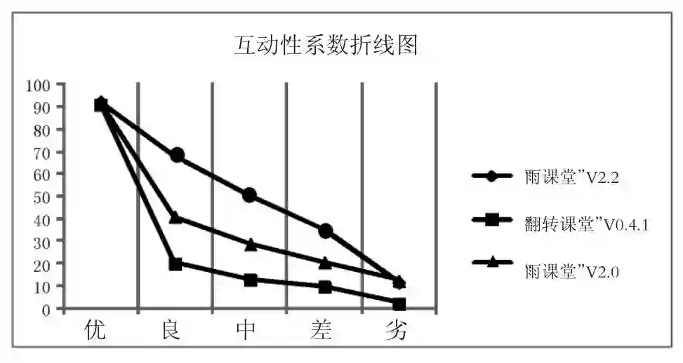 对 “雨课堂”V2.2、“翻转课堂”V0.4.1及 “雨课堂”V2.0的系数进行折算后,我们得出三组互动性系数值数组,分别用三种折线来表示,如图3所示。