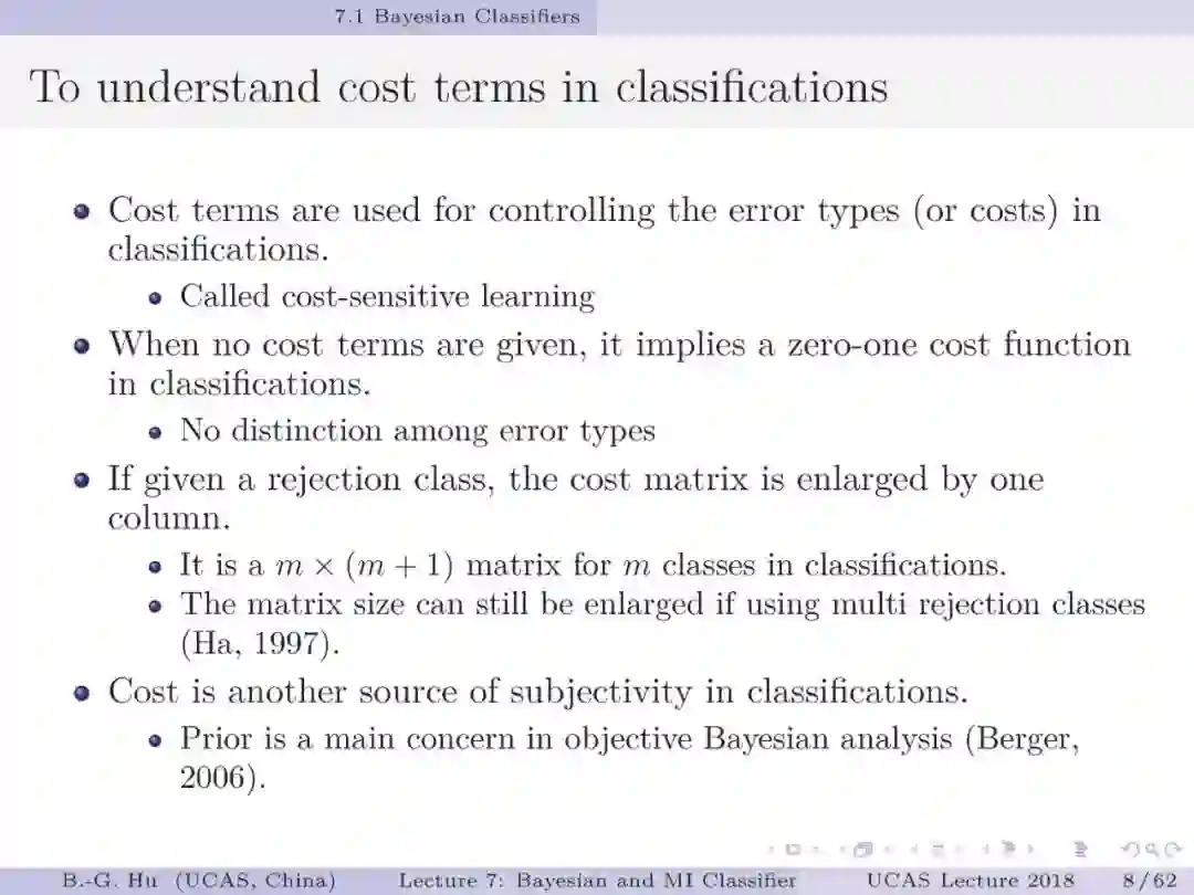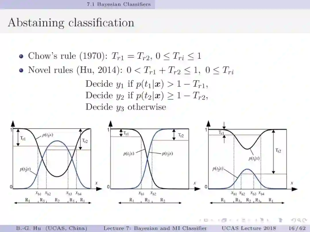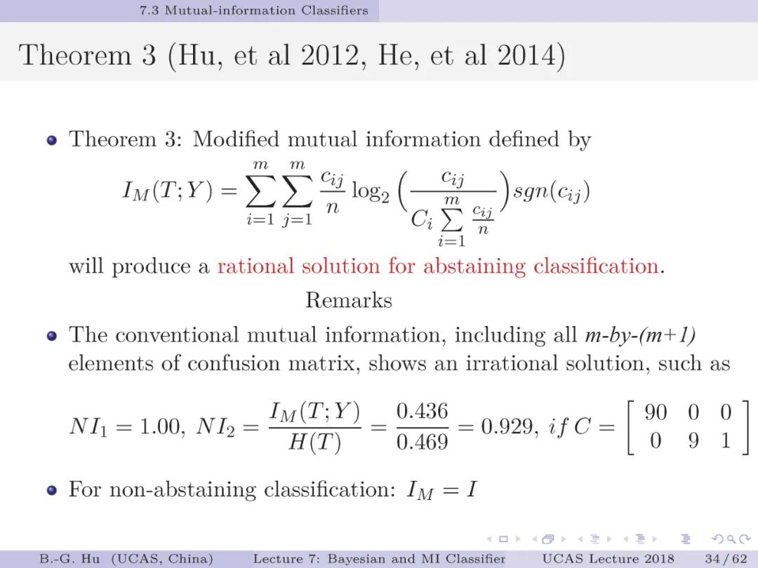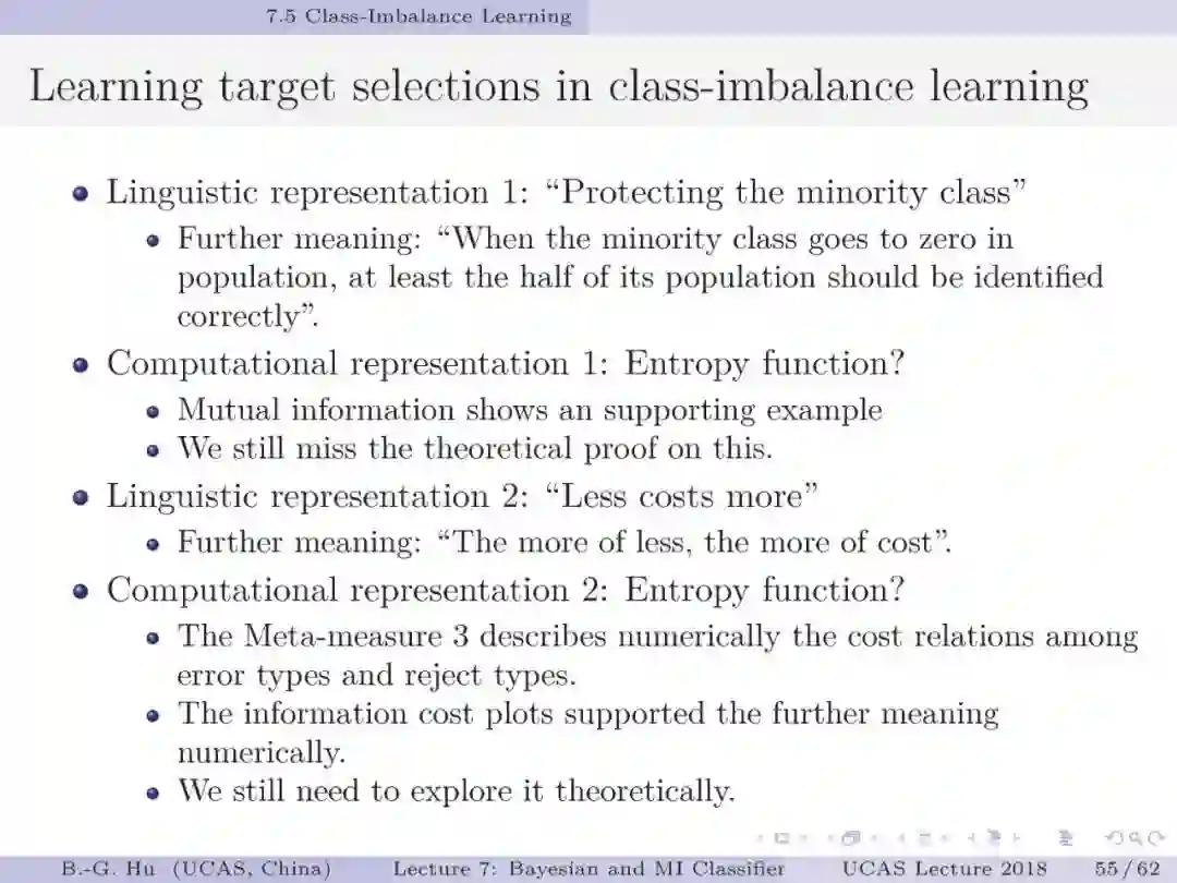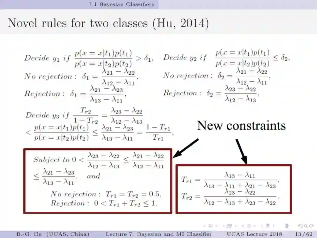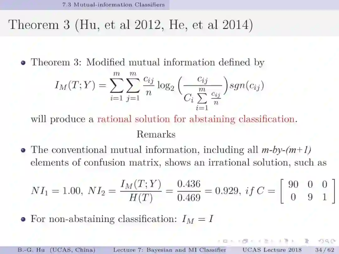 美籍华人学者周紹康(Chow,C.K.)1957年开创式将贝叶斯方法引入模式识别研究中,其它重要学术贡献还有:融合拒识智能决策于分类问题中与共同提出“周-刘”树的方法。这些都是创造知识的经典范例。本人正是受益于他1970年研究工作并扩展为不同拒识阈值(T_r1≠T_r2)情况下导出新的理论公式,更具一般性和图解释性(第13,14,16页)。目前教科书中通常是以单交叉点图(第14页中图)示意二值分类。其中三个定理扩充了机器学习与信息理论方面的基础知识。第一定理给出了不平衡数据下贝叶斯分类器将失效的证明。第二定理给出了代价矩阵中独立参数个数。这是参数可辨识性(即关于模型参数能否被惟一确定性质)研究内容。定理证明中应用了复合函数中独立参数个数上界是其中最小尺寸参数集的维数,可以理解为木桶原理中的短板决定木桶容量。该方式证明有利于延伸到对多类分类代价矩阵中独立参数个数的理解。第三定理给出了第二章中第3作业的解答。应用修正互信息定义不仅可以简单地解决问题,在非拒识情况下与原始互信息定义等价。它是否会引入其它问题还值得读者思考。