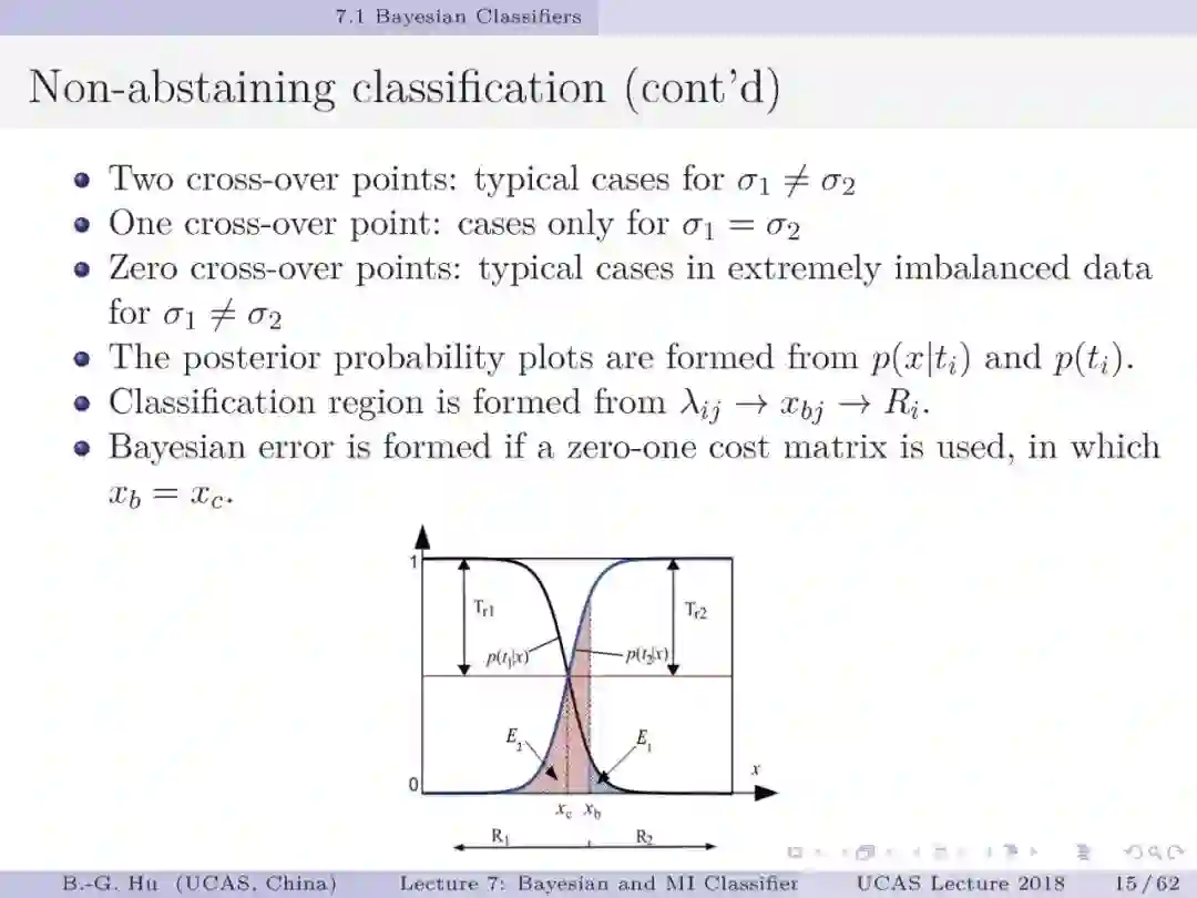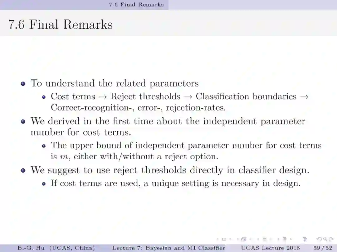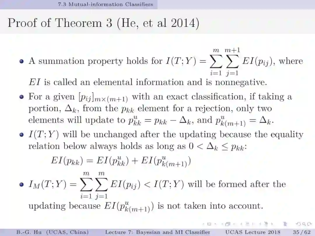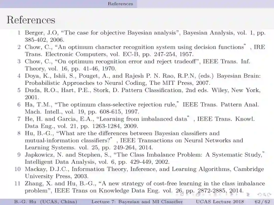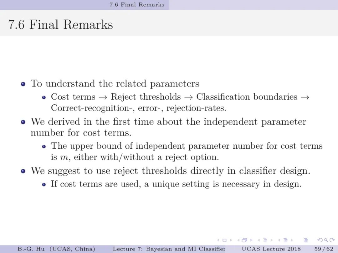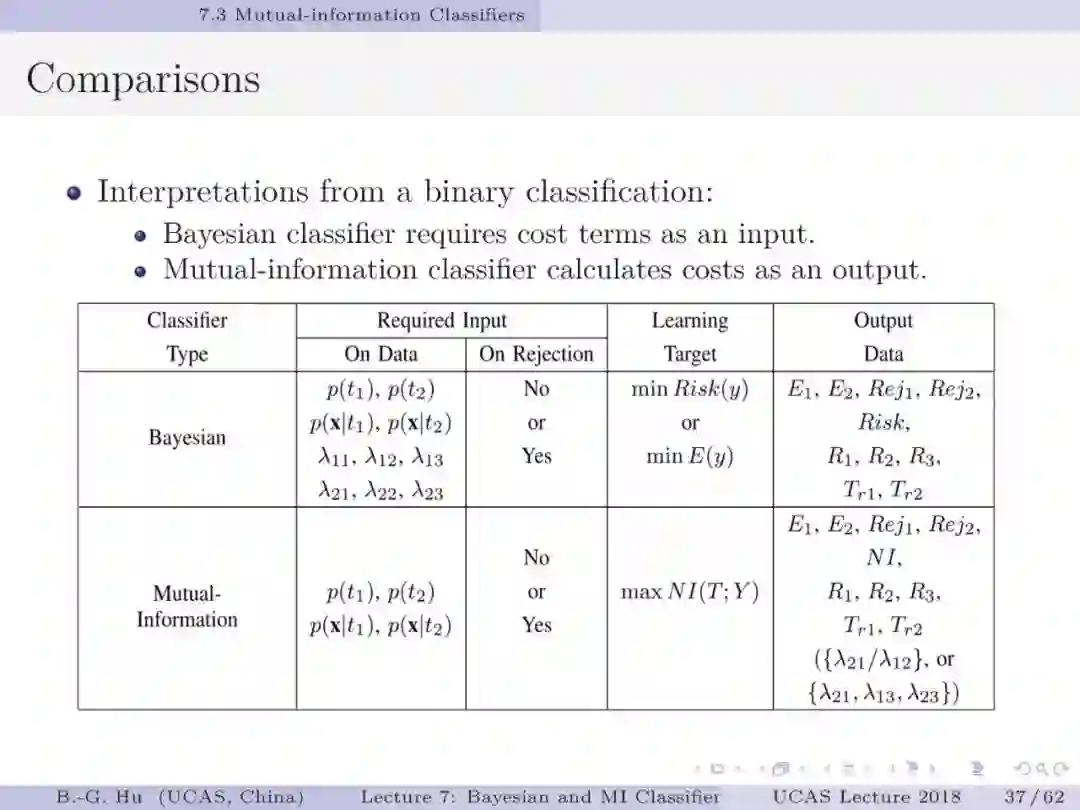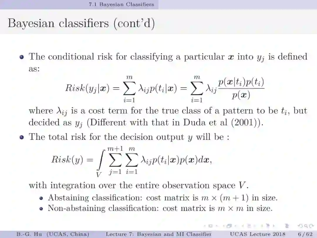 美籍华人学者周紹康(Chow,C.K.)1957年开创式将贝叶斯方法引入模式识别研究中,其它重要学术贡献还有:融合拒识智能决策于分类问题中与共同提出“周-刘”树的方法。这些都是创造知识的经典范例。本人正是受益于他1970年研究工作并扩展为不同拒识阈值(T_r1≠T_r2)情况下导出新的理论公式,更具一般性和图解释性(第13,14,16页)。目前教科书中通常是以单交叉点图(第14页中图)示意二值分类。其中三个定理扩充了机器学习与信息理论方面的基础知识。第一定理给出了不平衡数据下贝叶斯分类器将失效的证明。第二定理给出了代价矩阵中独立参数个数。这是参数可辨识性(即关于模型参数能否被惟一确定性质)研究内容。定理证明中应用了复合函数中独立参数个数上界是其中最小尺寸参数集的维数,可以理解为木桶原理中的短板决定木桶容量。该方式证明有利于延伸到对多类分类代价矩阵中独立参数个数的理解。第三定理给出了第二章中第3作业的解答。应用修正互信息定义不仅可以简单地解决问题,在非拒识情况下与原始互信息定义等价。它是否会引入其它问题还值得读者思考。