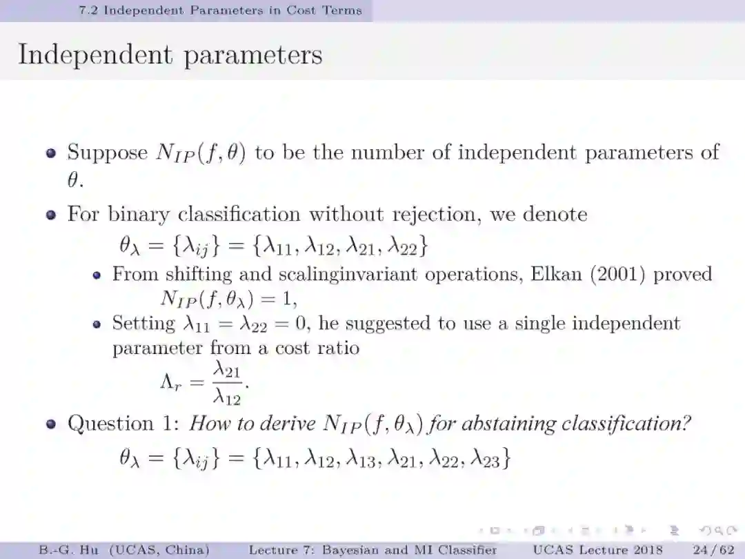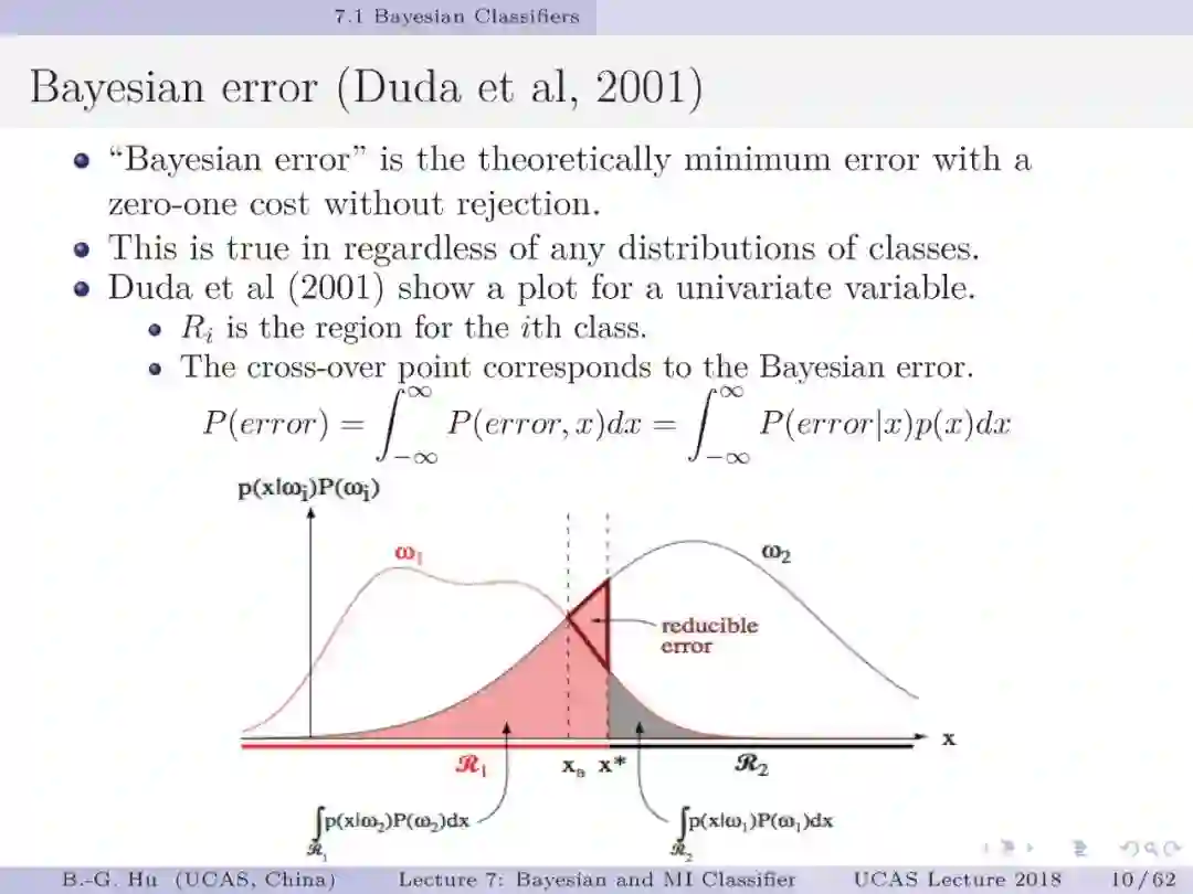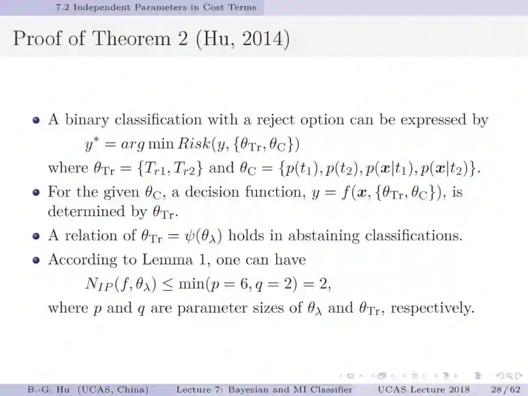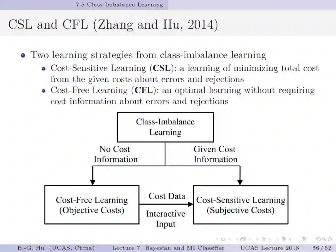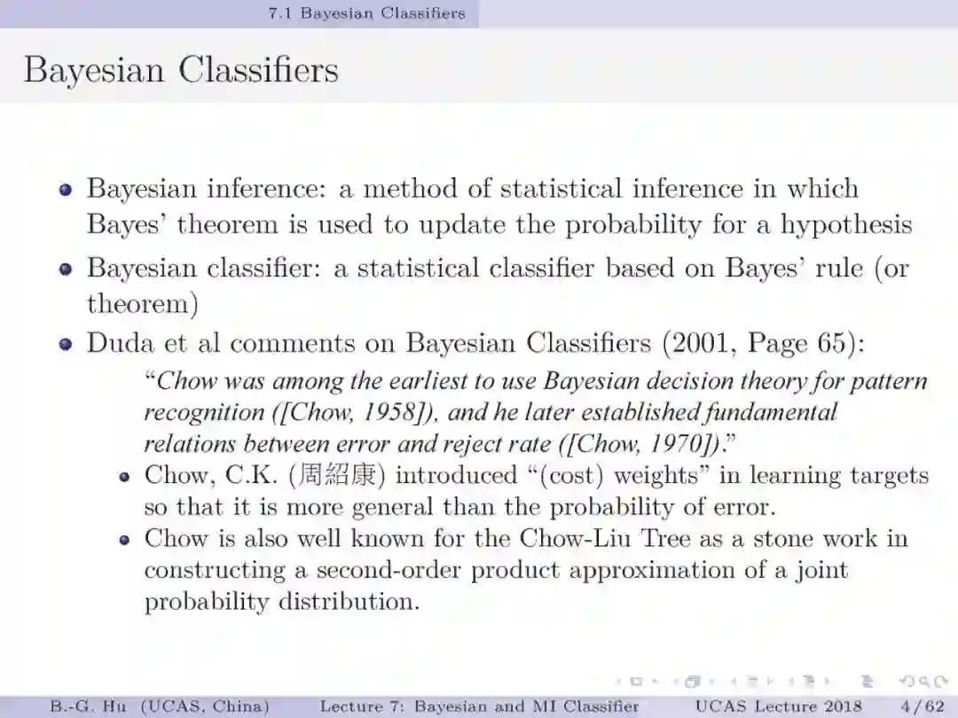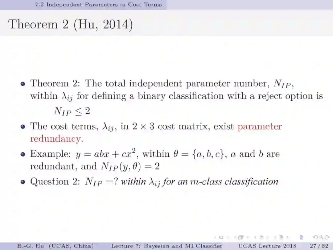 美籍华人学者周紹康(Chow,C.K.)1957年开创式将贝叶斯方法引入模式识别研究中,其它重要学术贡献还有:融合拒识智能决策于分类问题中与共同提出“周-刘”树的方法。这些都是创造知识的经典范例。本人正是受益于他1970年研究工作并扩展为不同拒识阈值(T_r1≠T_r2)情况下导出新的理论公式,更具一般性和图解释性(第13,14,16页)。目前教科书中通常是以单交叉点图(第14页中图)示意二值分类。其中三个定理扩充了机器学习与信息理论方面的基础知识。第一定理给出了不平衡数据下贝叶斯分类器将失效的证明。第二定理给出了代价矩阵中独立参数个数。这是参数可辨识性(即关于模型参数能否被惟一确定性质)研究内容。定理证明中应用了复合函数中独立参数个数上界是其中最小尺寸参数集的维数,可以理解为木桶原理中的短板决定木桶容量。该方式证明有利于延伸到对多类分类代价矩阵中独立参数个数的理解。第三定理给出了第二章中第3作业的解答。应用修正互信息定义不仅可以简单地解决问题,在非拒识情况下与原始互信息定义等价。它是否会引入其它问题还值得读者思考。