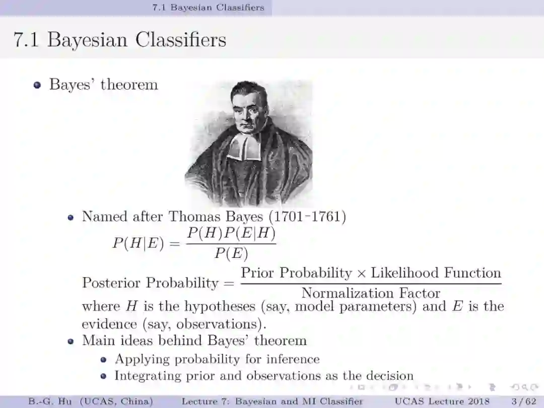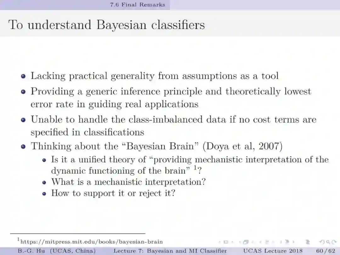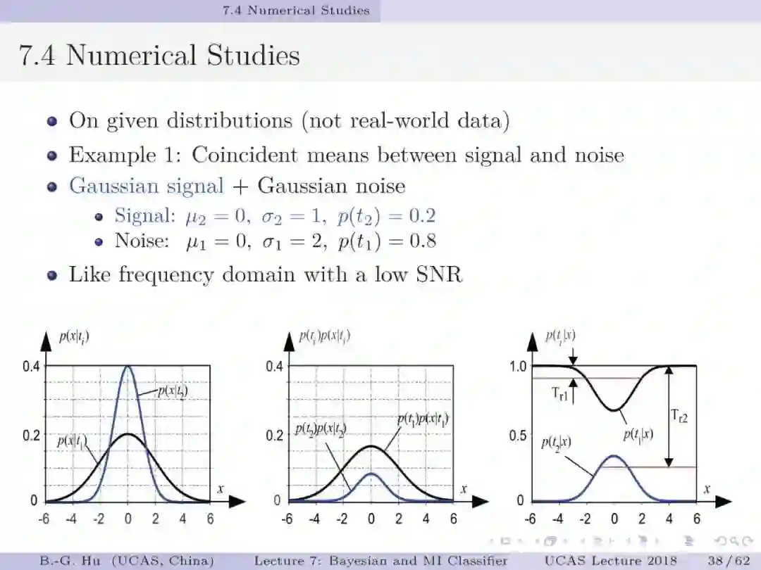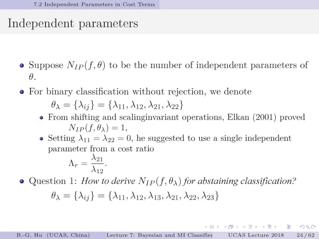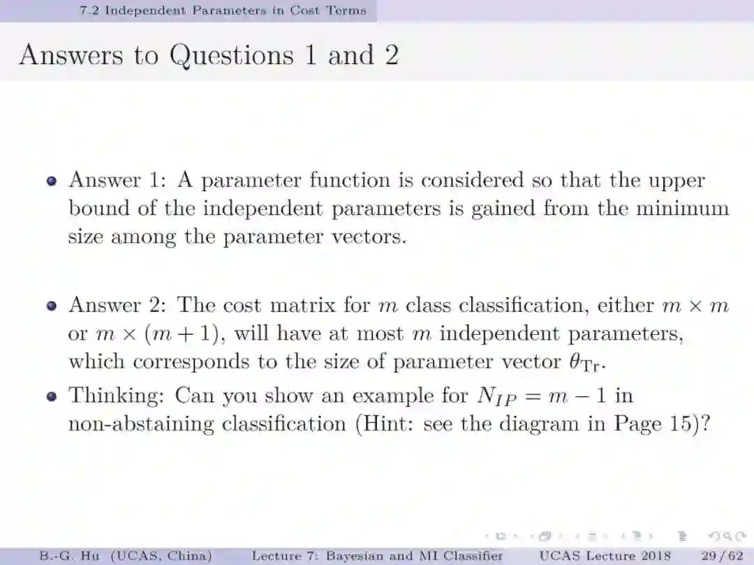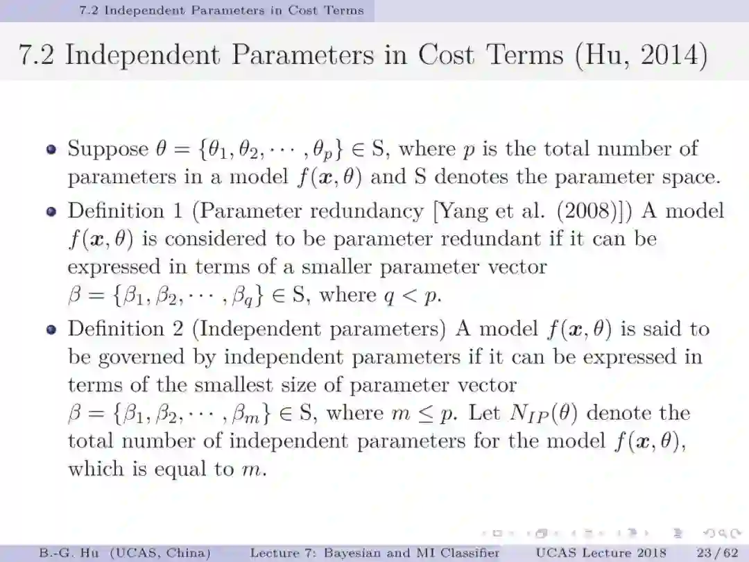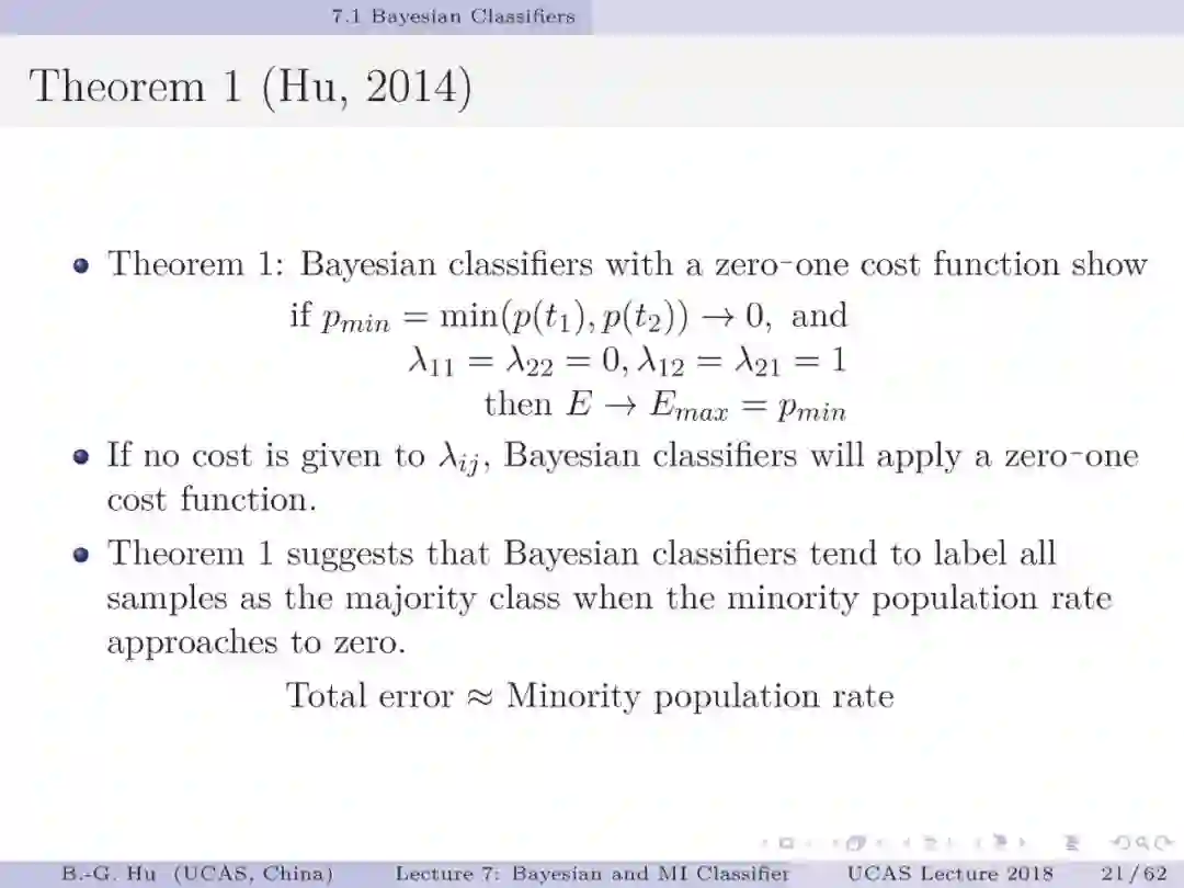 美籍华人学者周紹康(Chow,C.K.)1957年开创式将贝叶斯方法引入模式识别研究中,其它重要学术贡献还有:融合拒识智能决策于分类问题中与共同提出“周-刘”树的方法。这些都是创造知识的经典范例。本人正是受益于他1970年研究工作并扩展为不同拒识阈值(T_r1≠T_r2)情况下导出新的理论公式,更具一般性和图解释性(第13,14,16页)。目前教科书中通常是以单交叉点图(第14页中图)示意二值分类。其中三个定理扩充了机器学习与信息理论方面的基础知识。第一定理给出了不平衡数据下贝叶斯分类器将失效的证明。第二定理给出了代价矩阵中独立参数个数。这是参数可辨识性(即关于模型参数能否被惟一确定性质)研究内容。定理证明中应用了复合函数中独立参数个数上界是其中最小尺寸参数集的维数,可以理解为木桶原理中的短板决定木桶容量。该方式证明有利于延伸到对多类分类代价矩阵中独立参数个数的理解。第三定理给出了第二章中第3作业的解答。应用修正互信息定义不仅可以简单地解决问题,在非拒识情况下与原始互信息定义等价。它是否会引入其它问题还值得读者思考。
