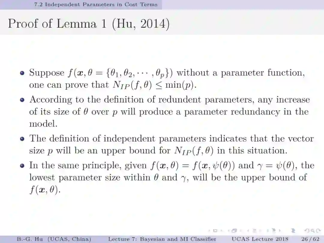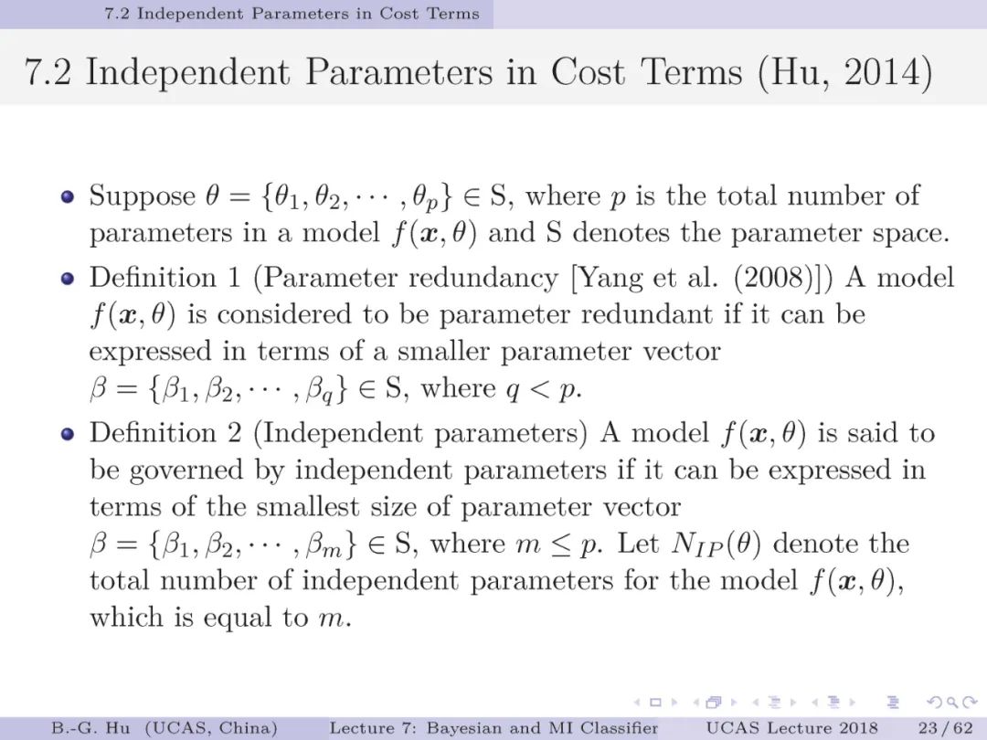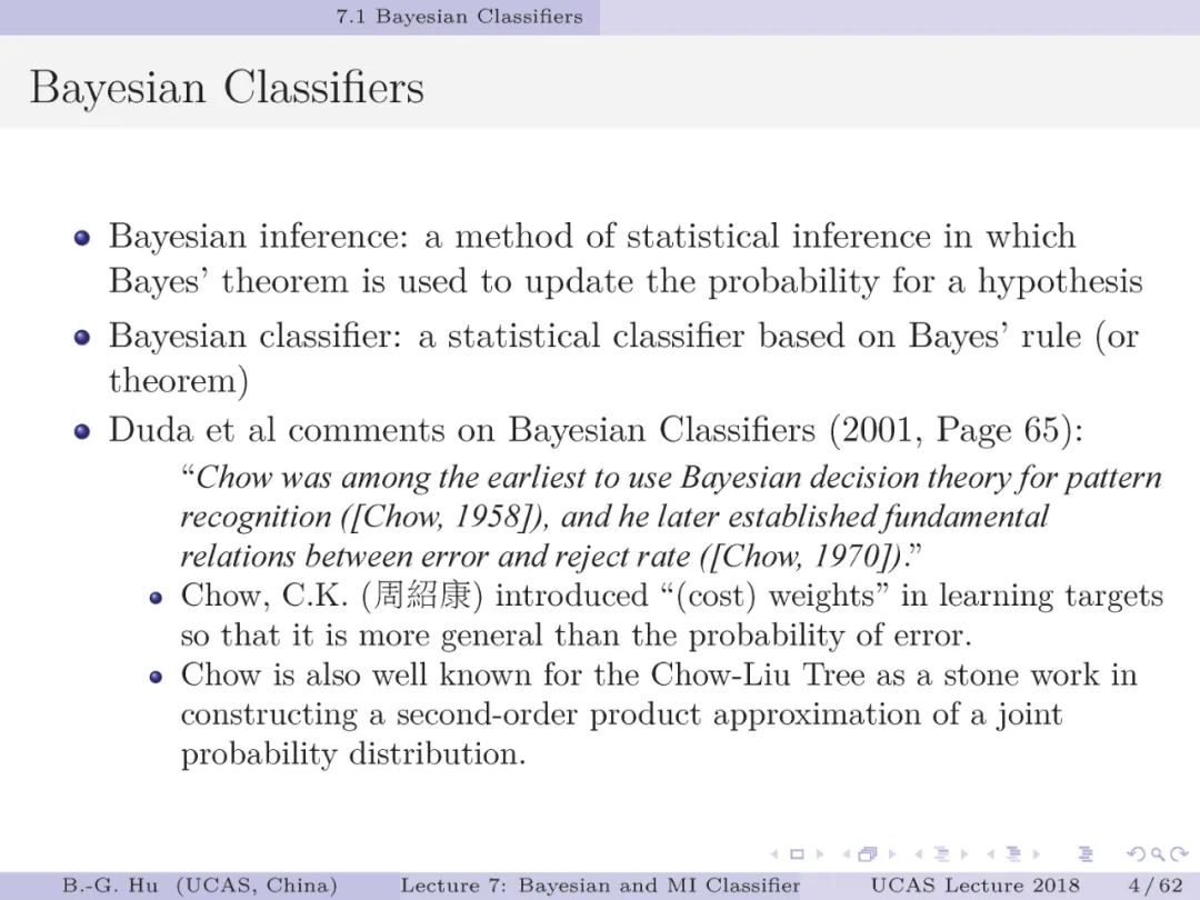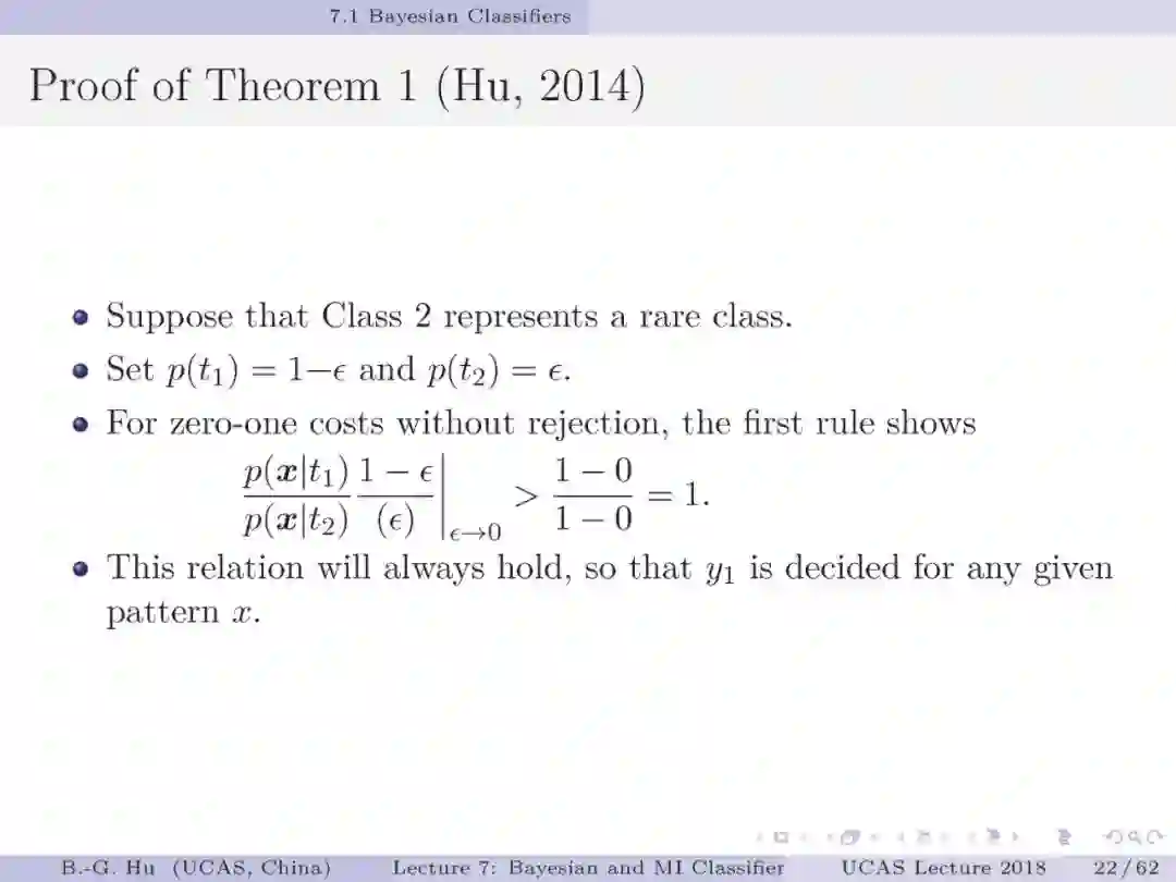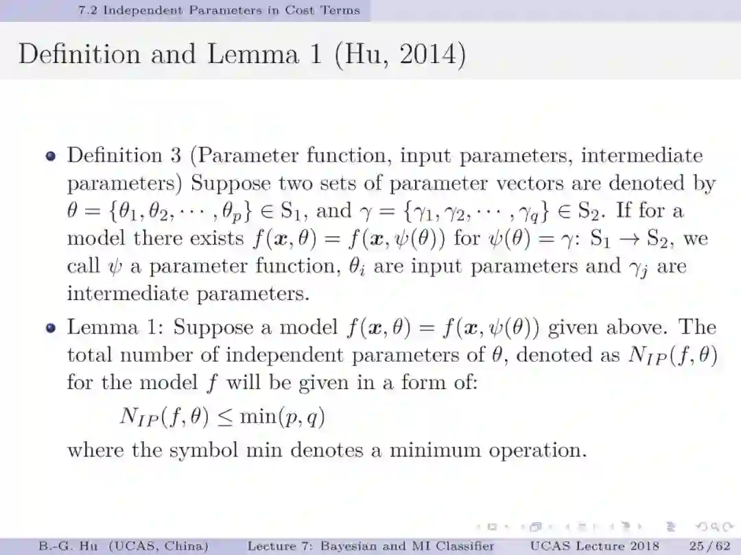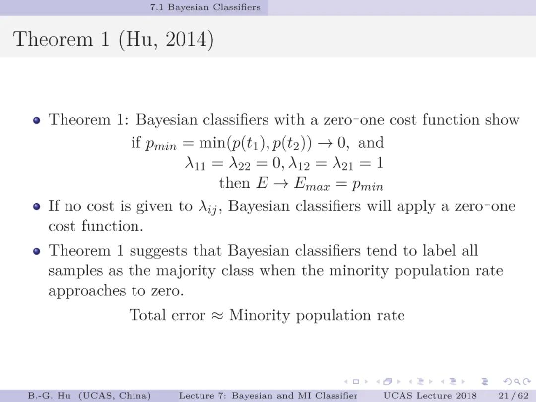 美籍华人学者周紹康(Chow,C.K.)1957年开创式将贝叶斯方法引入模式识别研究中,其它重要学术贡献还有:融合拒识智能决策于分类问题中与共同提出“周-刘”树的方法。这些都是创造知识的经典范例。本人正是受益于他1970年研究工作并扩展为不同拒识阈值(T_r1≠T_r2)情况下导出新的理论公式,更具一般性和图解释性(第13,14,16页)。目前教科书中通常是以单交叉点图(第14页中图)示意二值分类。其中三个定理扩充了机器学习与信息理论方面的基础知识。第一定理给出了不平衡数据下贝叶斯分类器将失效的证明。第二定理给出了代价矩阵中独立参数个数。这是参数可辨识性(即关于模型参数能否被惟一确定性质)研究内容。定理证明中应用了复合函数中独立参数个数上界是其中最小尺寸参数集的维数,可以理解为木桶原理中的短板决定木桶容量。该方式证明有利于延伸到对多类分类代价矩阵中独立参数个数的理解。第三定理给出了第二章中第3作业的解答。应用修正互信息定义不仅可以简单地解决问题,在非拒识情况下与原始互信息定义等价。它是否会引入其它问题还值得读者思考。