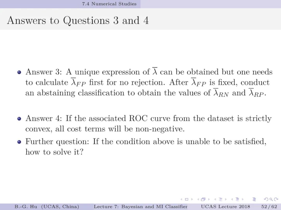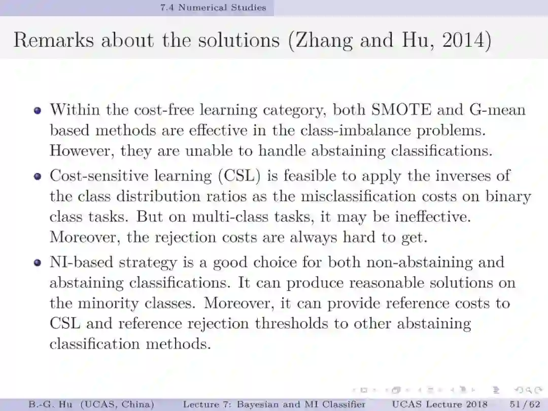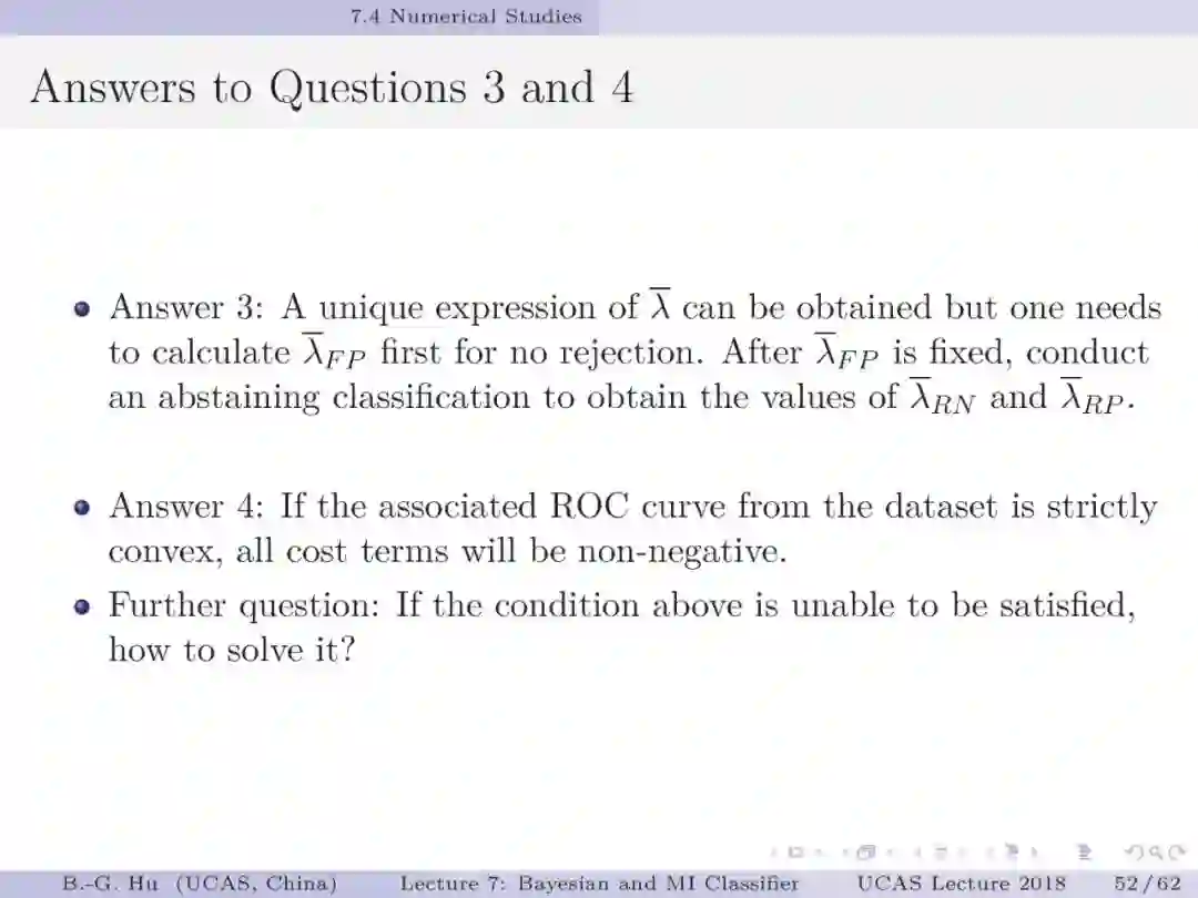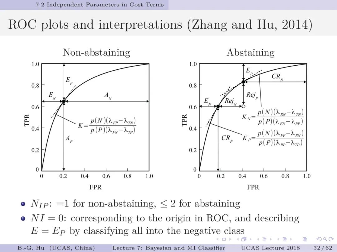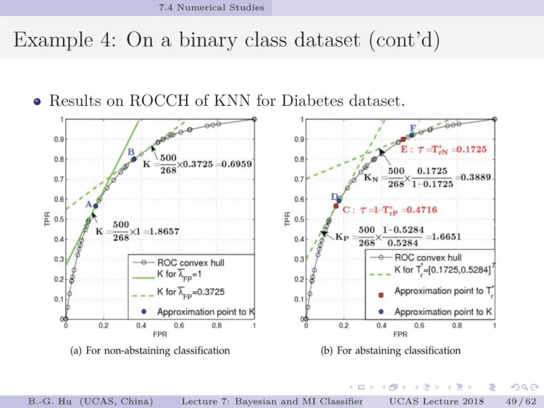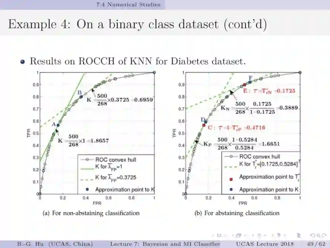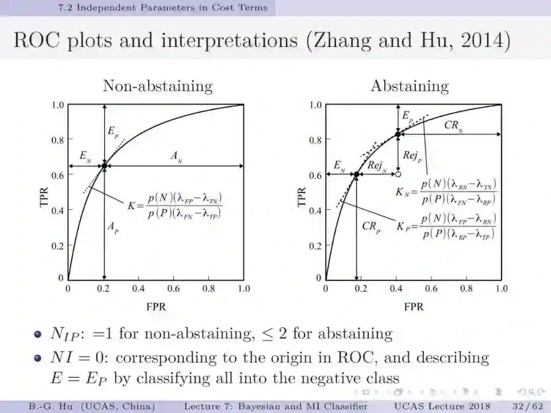 第32页: 希望同学们明白知识创新并非只是“高大上”的产物,只要是有心人,是可以预期获得的。由张晓晚博士发展的的拒识分类ROC曲线(第32页中右图)就是这样的实例。这是可以进入机器学习教科书中崭新基础知识。已有研究是应用三维方式描述拒识情况。而二维ROC曲线不仅常规应用,而且解释性更直接与简单(相关点给出的斜率计算公式解释与独立参数个数的解释)。要理解对于同一个ROC曲线,左右图是有关联的。左图只是右图中拒识率为零的特殊情况。另一方面,左图ROC曲线中黑点位置应该位于右图ROC两个黑点之间的曲线中(满足第13页中不等式关系)。为避免数据构成的ROC经验曲线导出代价矩阵中有负值情况,应用中采用ROC凸包曲线(ROCCH,第49页)常规方法。