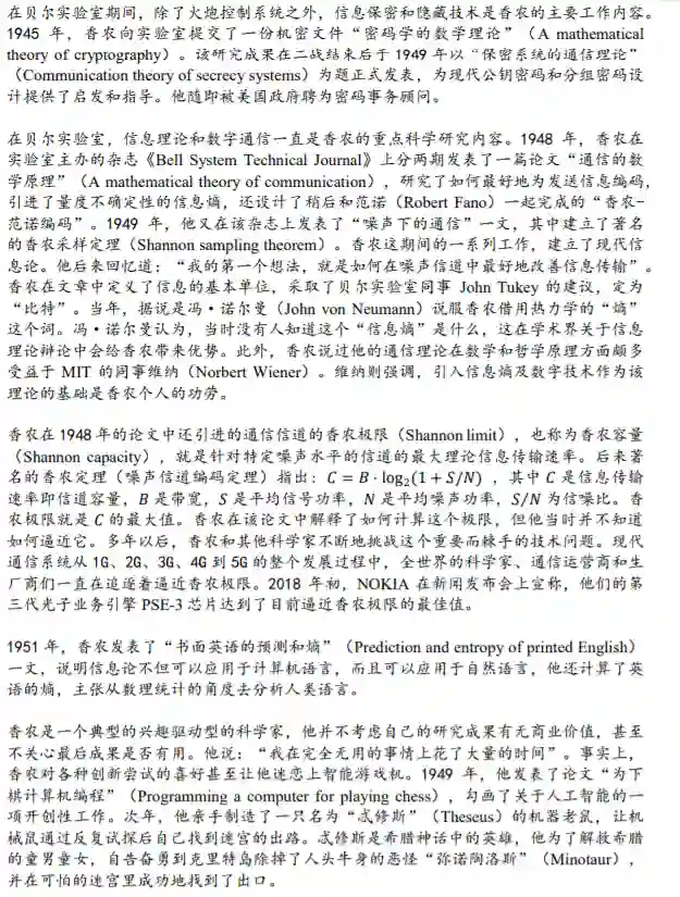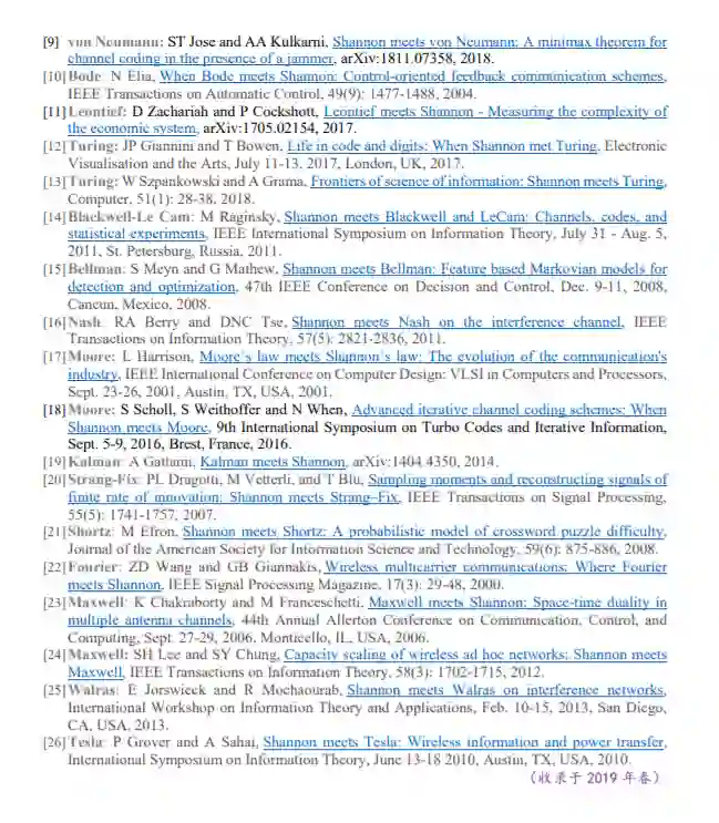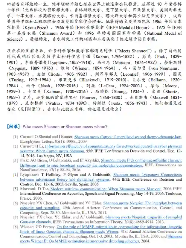 阅读后更要理解陈关荣教授给出有关参考文献中的寓意,这里的“遇见”是意指科学技术中已有知识是如何从原理上“遇见”香农。这些文章给出的启迪是研究工作要主动与香农“相遇”,有利于获得深度知识。我们已有研究工作正是受益于此:学会主动接受好的学术思想影响,并积极创新来影响他人。其中实例有冉智勇博士首次建立了参数可辨识性理论与信息论和最优化理论之间的联系,为参数可辨识性理论带来更为深刻的理论解释[3],而参数可辨识性应是统计机器学习模型中基础理论内容[4,5]。学习前人而非迷信,并相信好作品终会冒出(佩雷尔曼与华为产品等实例)。为破除迷信,本人建议“大师时代已然逝去?当下唯有作品为重!”的说法[6] (如有“惊诧”质疑,欢迎“专业”指正)。科研工作犹如艺术与文学创作,讲究作品文化。以专业方式勇于“吾往矣”是关键。质量如何,让同行与历史评说去吧。在此给同学们两个建议:1. 力争从“人工智能数学”或物理理论层面思考来主动与香农等大师“相遇”。2. 在未来工作中用你们的创新作品说话。
