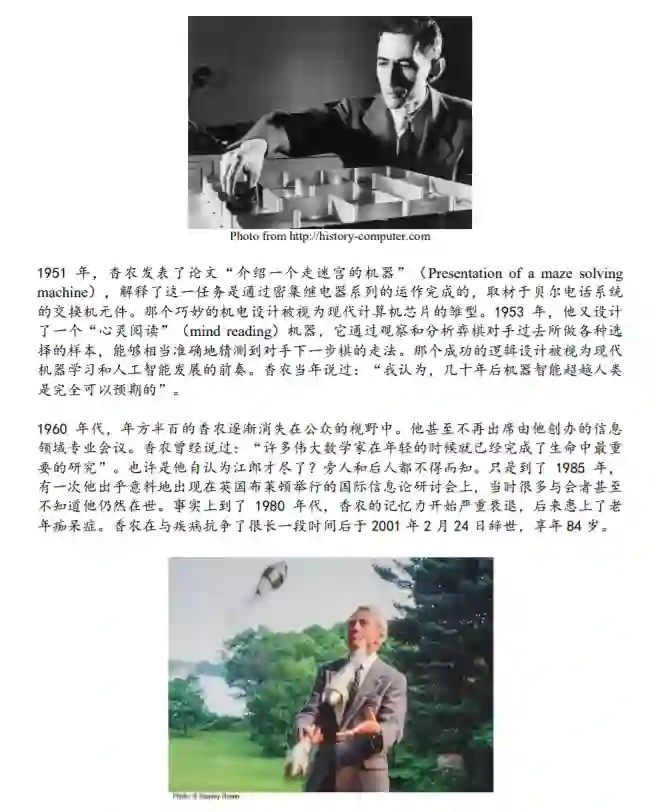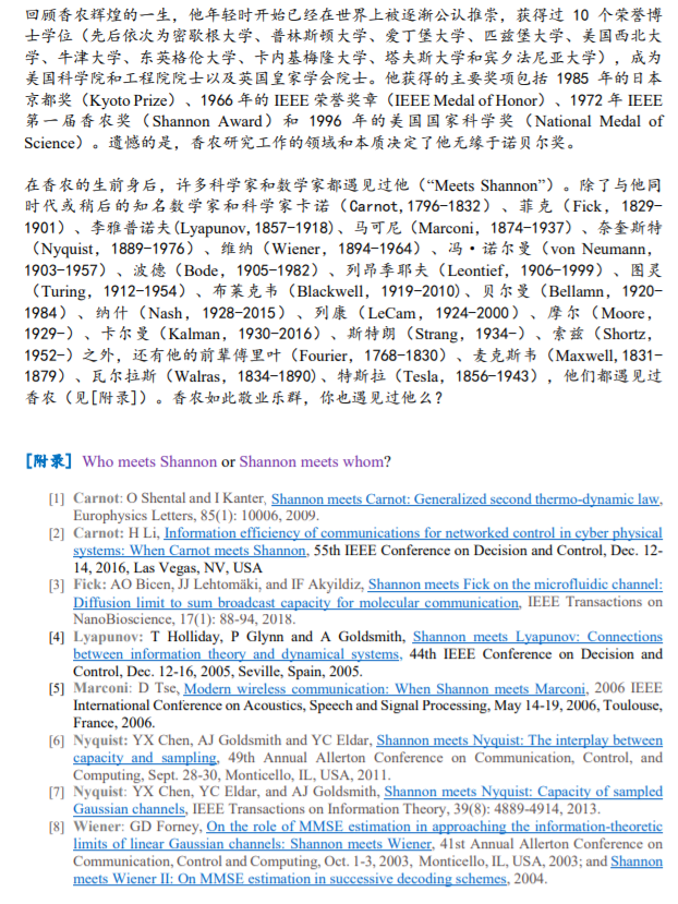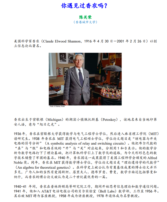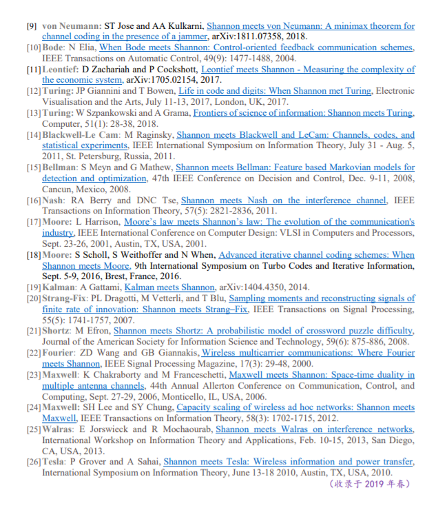 在介绍本人课件结束之际,我再次推荐读者阅读香港城市大学陈关荣教授的文章:“你遇见过香农吗?”[1]。还有珍贵视频[2, 3],其中香农教授讲述个人经历: "In the beginning I didn't think it would have an enormous impact. I enjoyed working on these problems, just like I enjoyed working on lots of other problems, without any ulterior motives for money or fame. And I think that a lot of other scientists have this same approach, they work because of their love of the game". 向香农教授致敬!感谢他开启了新世界并告知我们应该如何开展科研工作。