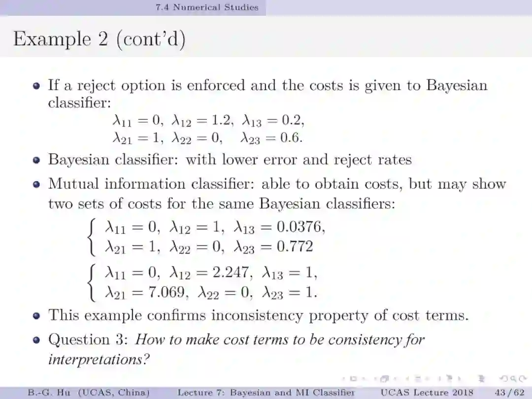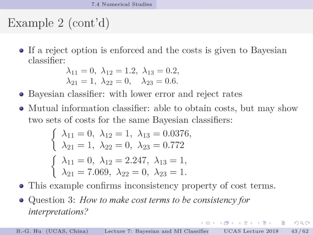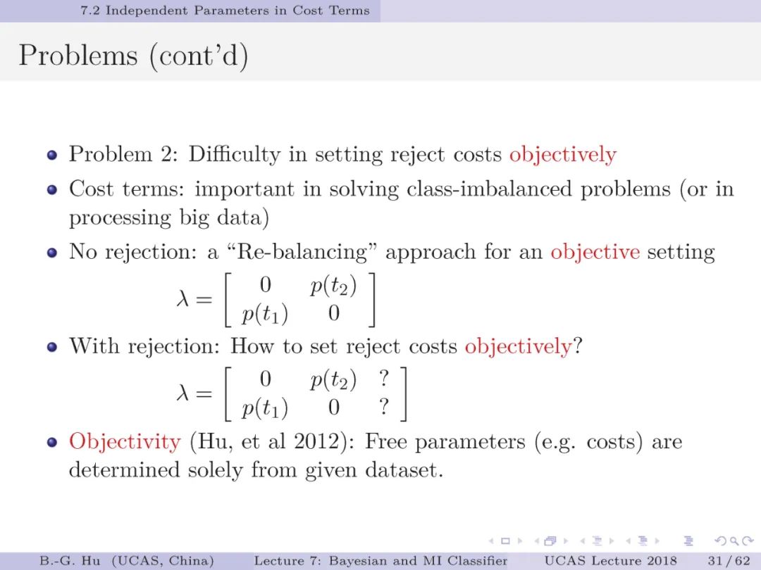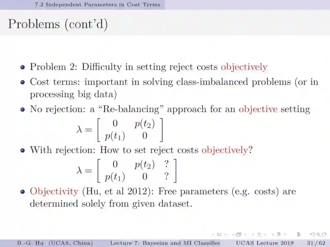 第45,52页: 应用互信息分类器可以根据数据分布获得拒识阈值方面的信息。考虑到拒识分类常规应用中人们习惯应用代价矩阵。我们提出了代价矩阵计算方法,并保证解释一致性。该方法提出了两步计算方式。第一步是应用互信息分类器对数据按照非拒识分类计算,计算结果可以唯一确定一个代价参数。第二步 是应用互信息分类器对数据按照拒识分类计算,获得拒识阈值具体值两个(T_r1与T_r2)。根据第13页中拒识阈值与代价参数之间的关系,以及其中四个代价参数已知(见第45页),可以唯一确定剩余两个固定代价参数。由此确保代价矩阵是唯一结果,实现了解释一致性。