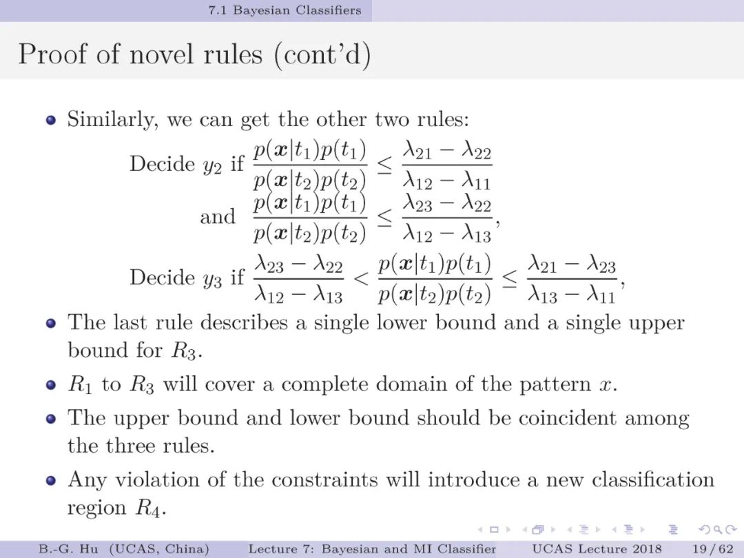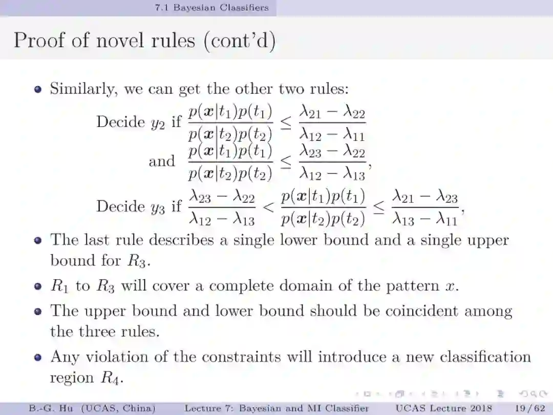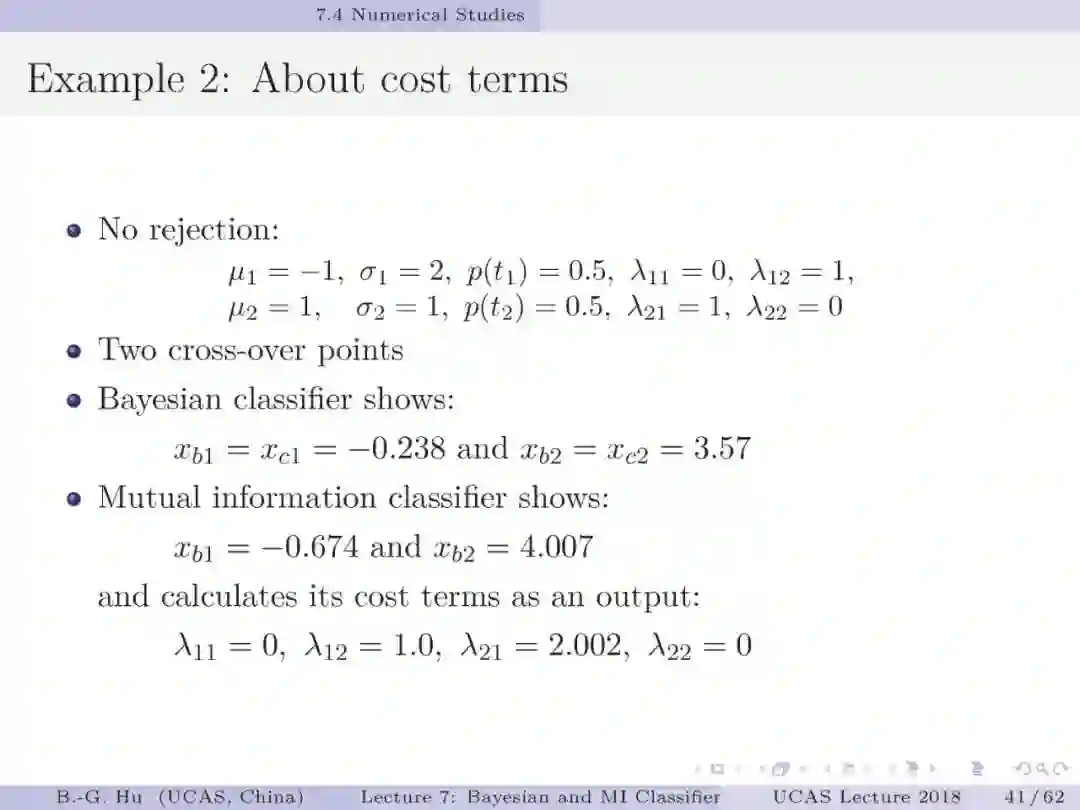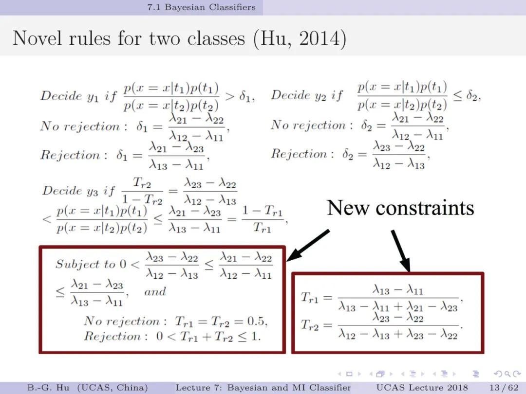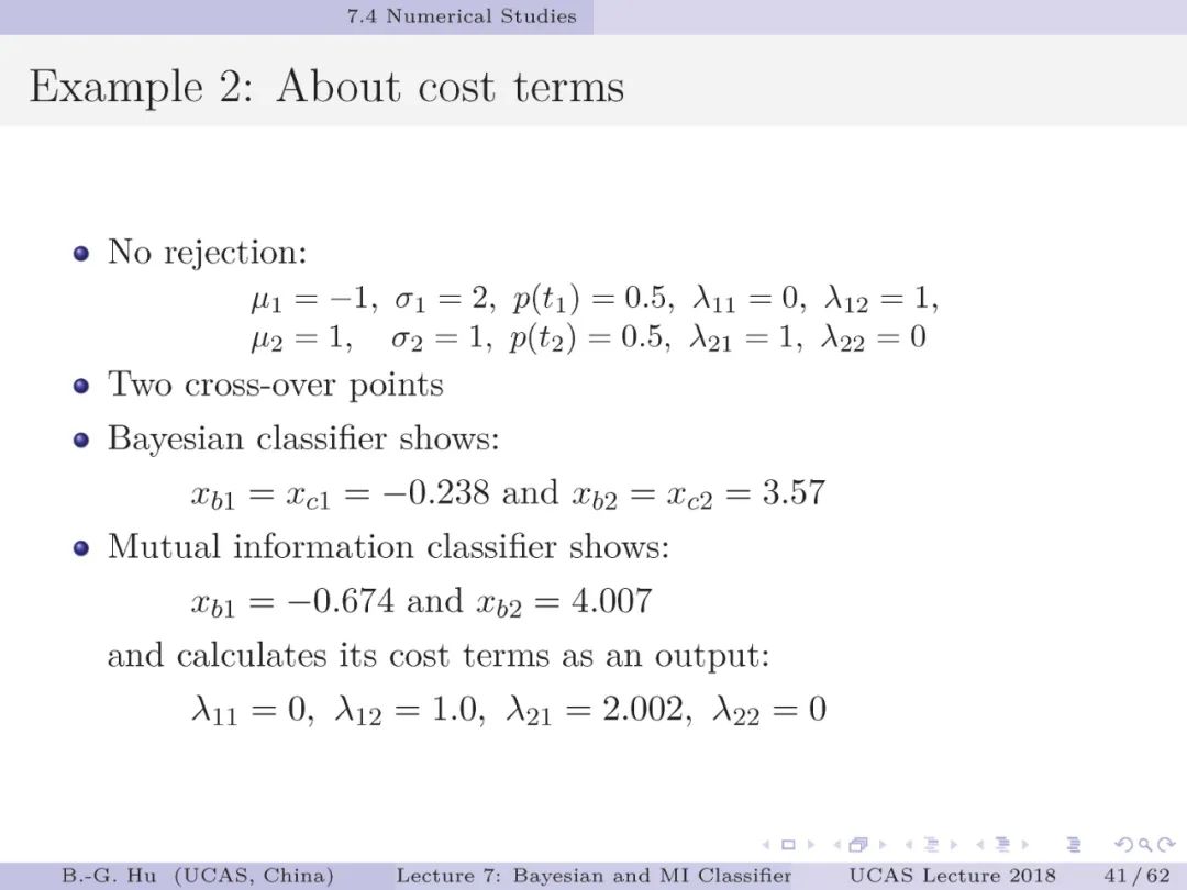 第45,52页: 应用互信息分类器可以根据数据分布获得拒识阈值方面的信息。考虑到拒识分类常规应用中人们习惯应用代价矩阵。我们提出了代价矩阵计算方法,并保证解释一致性。该方法提出了两步计算方式。第一步是应用互信息分类器对数据按照非拒识分类计算,计算结果可以唯一确定一个代价参数。第二步 是应用互信息分类器对数据按照拒识分类计算,获得拒识阈值具体值两个(T_r1与T_r2)。根据第13页中拒识阈值与代价参数之间的关系,以及其中四个代价参数已知(见第45页),可以唯一确定剩余两个固定代价参数。由此确保代价矩阵是唯一结果,实现了解释一致性。