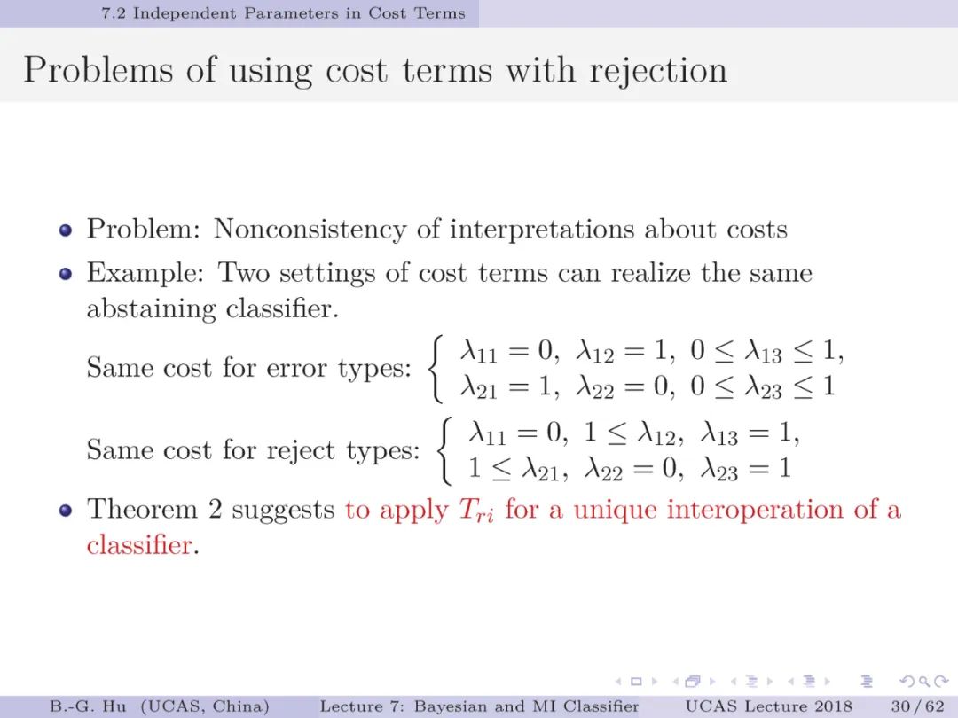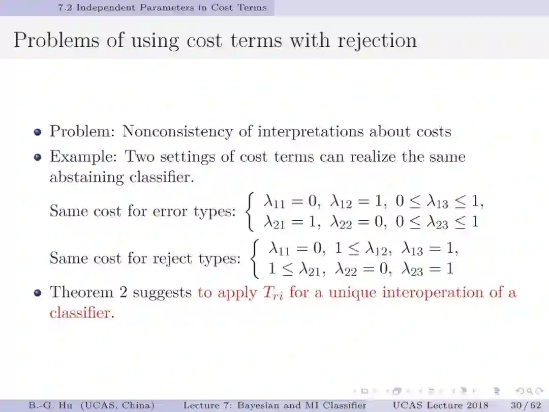 第30,43页: 解释为什么在拒识分类中应用代价矩阵会有解释不一致性问题。这里以二值分类为例,会存在两组参数是代表了同一个分类器。而第一组对应了误差代价固定且相同,只是拒识代价不同。第二组对应了拒识代价固定且相同,只是误差代价不同。这种现象被称为解释不一致性。由此会在应用中产生混乱的解释结果。而应用拒识阈值可以获得唯一解释性。