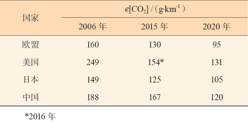 由于 CO2 气体的温室效应会造成全球气候变暖,欧盟、美国、日本等国均制定了 CO2 限值来限制汽车 CO2 排放。中国也根据油耗法规折算出 CO2 限值。表 2 给出了不同阶段各国 CO2 排放限值。从表 2 看出,类似于其他汽车强国,中国制定的 CO2 限值也越来越严格,且给予实现目标的时间越来越短。但是目前中国对于 CO2排放的降低主要是通过降低燃油消耗量来实现,而专门针对降低 CO2 的技术并没有得到足够的重视。例如发动机燃用低碳燃料可显著降低 CO2 排放,但是对于低碳燃料在发动机中的应用还未引起广泛关注。