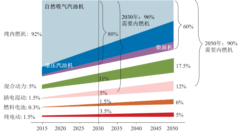 内燃机在未来 30 年仍然起到关键作用,预测至少 60% 以上的轻型汽车需要一个内燃机。