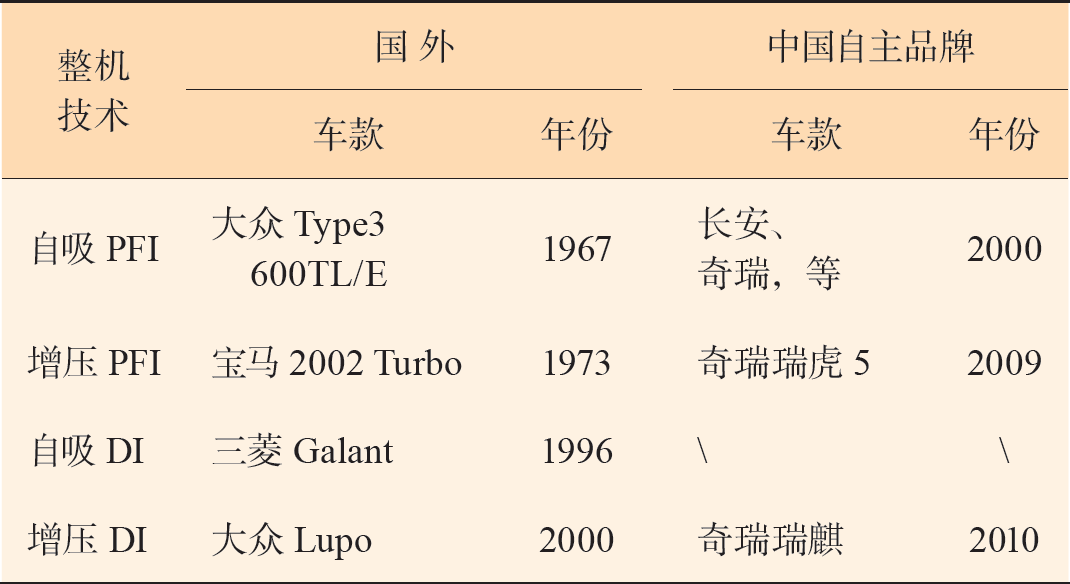 随着进气和燃油喷射技术的发展,汽油机整机技术也相应地得到提高。以燃油喷射技术为特征的整机技术经历了从自然吸气 PFI 汽油机、废气涡轮增压 PFI 汽油机到自然吸气 GDI 汽油机,再到目前主流的废气涡轮增压 GDI 汽油机。以上市产品为例,表 1 总结对比了国内外整机技术的发展历程。1967 年德国大众汽车公司已有 PFI 汽油机上市;宝马汽车在 1973 年推出了 2.0 L 增压 PFI 汽油机。1996 年日本三菱公司首先推出了现代 GDI 汽油机,应用在 Galant 车型。该款发动机排量为 1.8 L,采用分层稀薄燃烧技术。2000 年德国大众汽车公司推出了增压直喷汽油机,应用在 Lupo 车型。该款发动机排量为 1.4 L,采用当量燃烧技术。