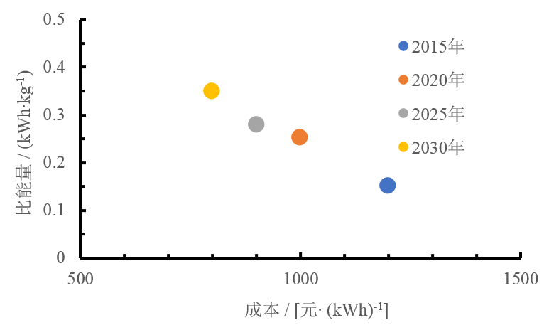 图 10 给出了「中国节能与技术路线图」[30] 中对电动汽车电池系统能量密度及成本的预测。从图中可以看到,随着技术的进步,未来的电池比能量有望进一步提高,且同时可以保证电池成本持续降低。但是预测在 2030 年,即使电池能量密度能够获得翻倍的提升,其比能量也仅为 0.35 kWh/kg,和传统燃料的能量密度相差仍然甚远。