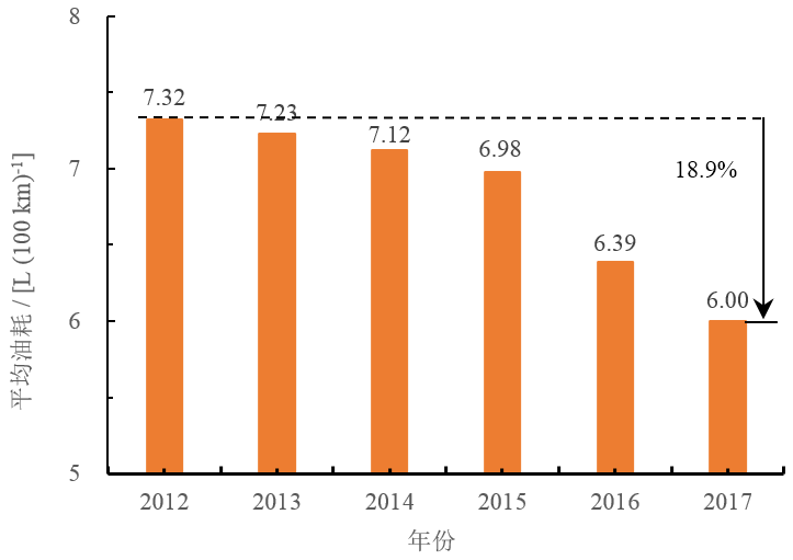 为便于评价中国轻型车汽油机燃油经济性的进步,图 7 对比了中国国家工信部公布的 2012-2017年国产乘用车当年新车公告的平均燃油消耗量水平。从总体趋势可以看到,中国新车的平均燃油消耗量逐年下降,2017 年已降至 6 L/(100km),比 2012 年降低 18.9%,由法规驱动的技术进步十分明显。