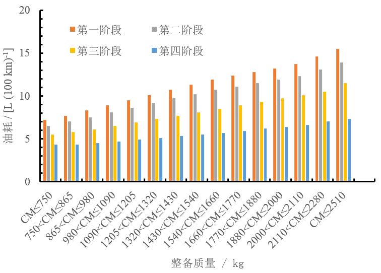 自 2005 年开始,中国先后实施/制定了 4 个阶段的乘用车燃油消耗量限值法规,用于推动汽车节能技术的革新。图 6 给出了中国轻型车在 4 个阶段不同整车整备质量对应的燃油消耗量限值。通过燃油法规的实施,促使乘用车企业对其所销售车辆的平均油耗不断降低。到 2020 年,乘用车企业平均燃油消耗量4阶段目标值需降低至 5 L/(100 km) [24-25]。