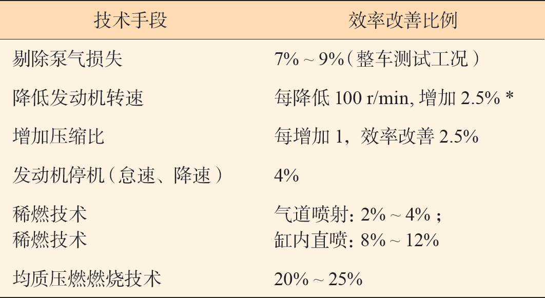 一般来讲发动机消耗燃油产生的能量主要有如下 5 部分组成:有效功、传热损失、排气损失、机械损失及燃烧损失。改善发动机的热效率,即在不改变能量输入的情况下,尽量提高有效功的输出,减少其他部分的能量比例。几乎所有提高热效率的技术手段都是秉承以上的准则。表 4 给出了笔者在早期研究中总结的提高汽油机热效率的一些技术手段和收益 [40]。可以看到,各个技术手段的应用都能获得较为可观的热效率改善程度。由于传统车型对发动机的高要求,阻碍了部分技术手段的应用。混动系统给予发动机更大的优化空间,这些技术手段的应用或许不再受限。