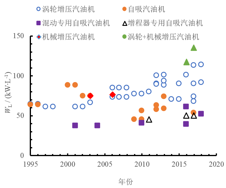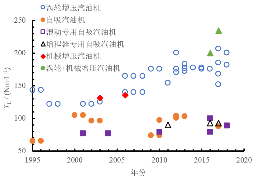 为展示发动机在动力性上的进步,本文选取并对比了历年美国沃德十佳发动机 [19](自 1995 年开始)及中国心十佳发动机 [20](自 2006 年开始)获奖名单中 4 缸汽油机产品的升功率(WL)及升扭矩(TL)指标,如图 4 所示。可以看出:采用增压技术可显著提高发动机动力性,且随着时间发展,增压发动机的动力性指标也取得了很大提升。国外发动机采用的增压技术包括涡轮增压、机械增压以及涡轮与机械双增压。以采用涡轮与机械双增压发动机的沃尔沃 S60 Polestar 汽车为例,其升功率和升扭矩已分别达到 135 kW/L 和 235 Nm/L。从总体上讲,在过去 20 年里,国外增压汽油机的平均升功率从 60 kW/L 提高到 100 kW/L 以上,提高了 67% 以上,同时升扭矩从 120 Nm/L 提高到 200 Nm/L,进步十分显著。对于涡轮增压发动机来说,中国自主品牌发动机的动力性大概与国外发动机 10 年前的水平相当,但是在过去十几年里也取得了明显进步,平均升功率从 60 kW/L 提高到了 88 kW/L 左右,提高了约 47%。对于自然吸气发动机的动力性,多年来并未有显著提高,国内外发动机的动力性基本相当,升功率保持在 50-55 kW/L。还需注意的是,由于车用动力的多元化发展,国外逐渐出现混动专用发动机,且以自然吸气为主。