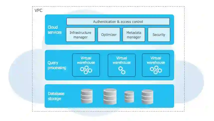 用户可以使用 SQL 或者其他商业智能和机器学习工具来查询半结构化数据。Snowflake 还支持 XML、JSON、Avro 等文档存储格式的本地支持。其混合架构划分为三个不同的层:云服务层、计算层和存储层。