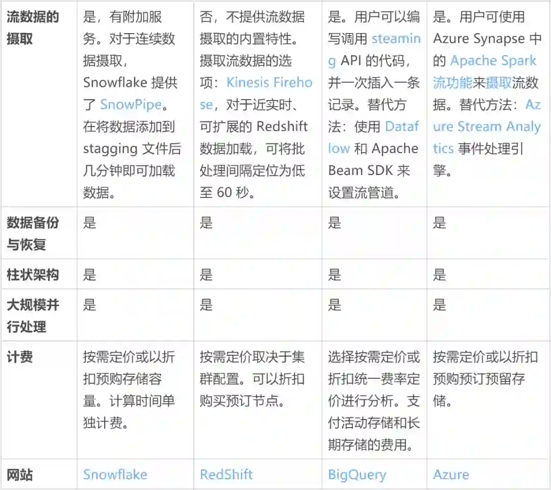 支持实时工作负载。数据生成之后,很多公司都需要立即进行分析。例如,有些公司可能需要实时检测欺诈或安全问题,而另一些公司可能需要处理大量的流式物联网数据来进行异常检测。在这些情况下,评估不同的云数据仓库如何处理流数据摄取是很重要的。BigQuery 提供了一个流 API,用户可以通过几行代码来调用。Azure 提供了一些实时数据摄取选项,包括内置的 Apache Spark 流功能。Snowflake 提供了 Snowpipe 作为附加组件来实现实时摄取,而 RedShift 则需要使用 Kinesis Firehose 进行流数据摄取。