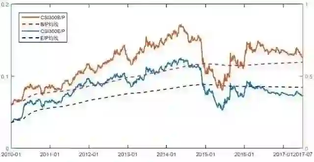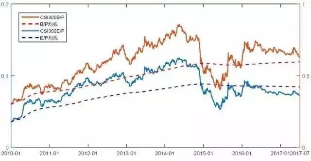 所以如果我们要验证某个因子的有效性是否产生了本质上的变化需要分两步走:第一步,我们要验证现有数据是否充分体现了我们要捕捉的因子,第二步才是测试这个因子是否有效。比如B/P和E/P虽然都是传统的经典价值因子,但在同一时间段,它们俩却可以给出不同结论。沪深300的B/P目前是在高于历史平均值的,而它的E/P却是低于历史平均值(见下图)。两者同为价值因子,但给出的结论完全不一样。所以如果要评判价值因子的有效性,我们首先要找到真正反映价值的因子,然后才能测试它的有效性。用比较短的历史数据去预测一个没有统一认同的因子或子策略是极其有挑战性的。