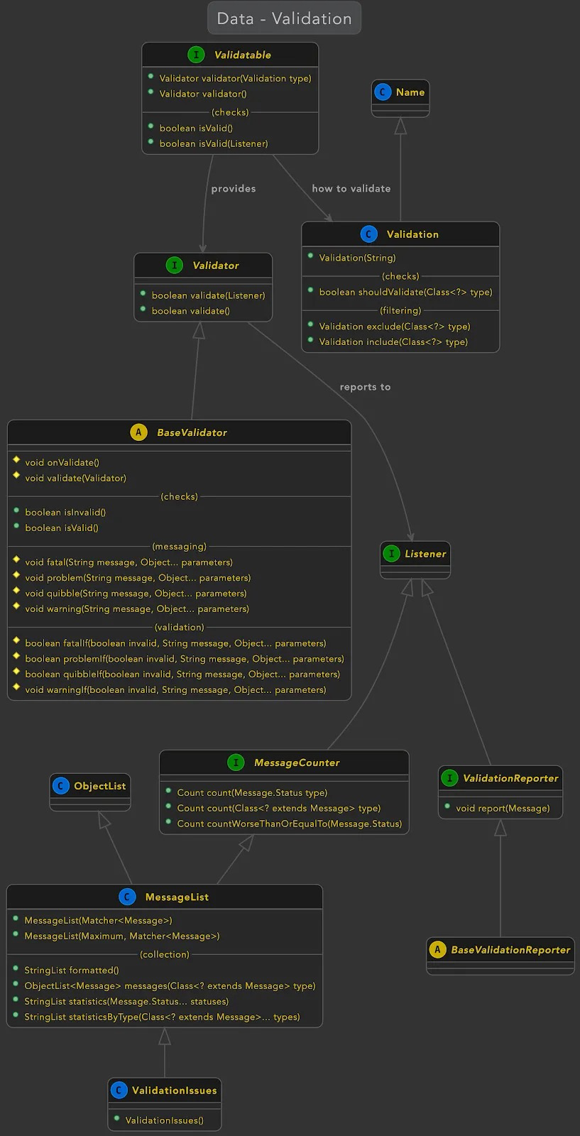 public class User implements Validatable{String name;[...]@Overridepublic Validator validator(ValidationType type){return new BaseValidator(){@Overrideprotected void onValidate(){problemIf(name == null, "User must have a name");}};}}public class MyComponent extends BaseComponent{public void myMethod(){var user = new User("Jonathan");if (user.isValid(this)){[...]}}}