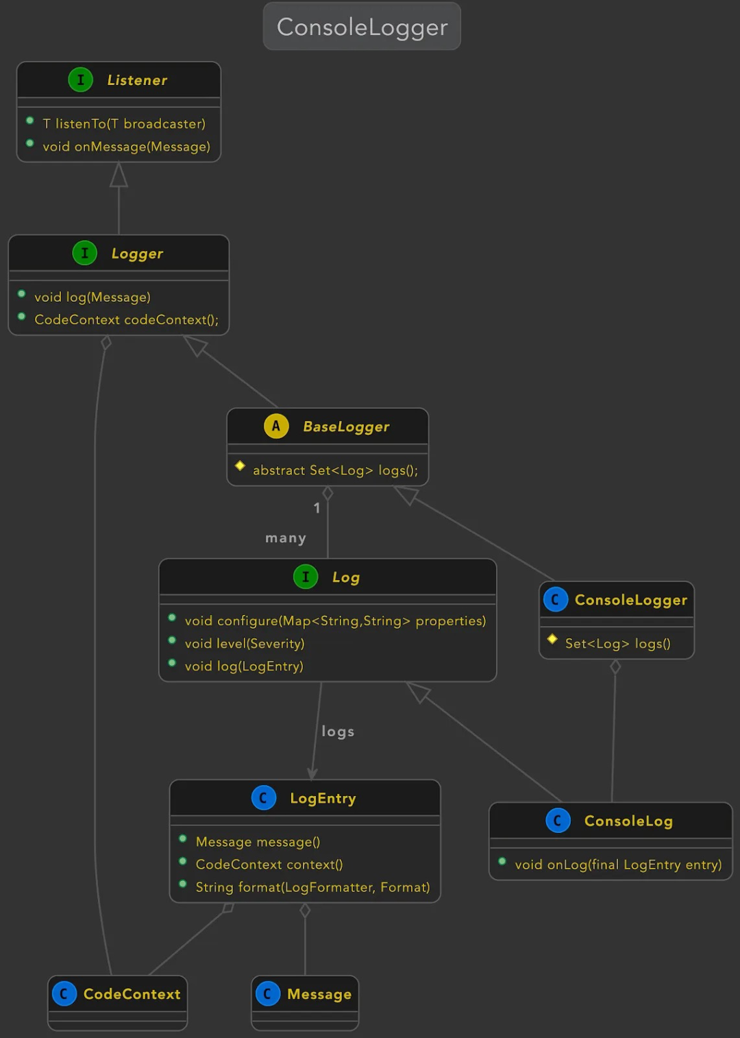 public class ConsoleLogger extends BaseLogger{private Log log = new ConsoleLog();@Overrideprotected Set<Log> logs(){return Sets.of(log);}}public class BaseLogger implements Logger{void onMessage(final Message message){log(message);}public void log(Message message){[...]for (var log : logs()){log.log(entry);}}}public class ConsoleLog extends BaseTextLog{private Console console = new Console();@Overridepublic synchronized void onLog(LogEntry entry){console.printLine(entry.message().formatted());}}