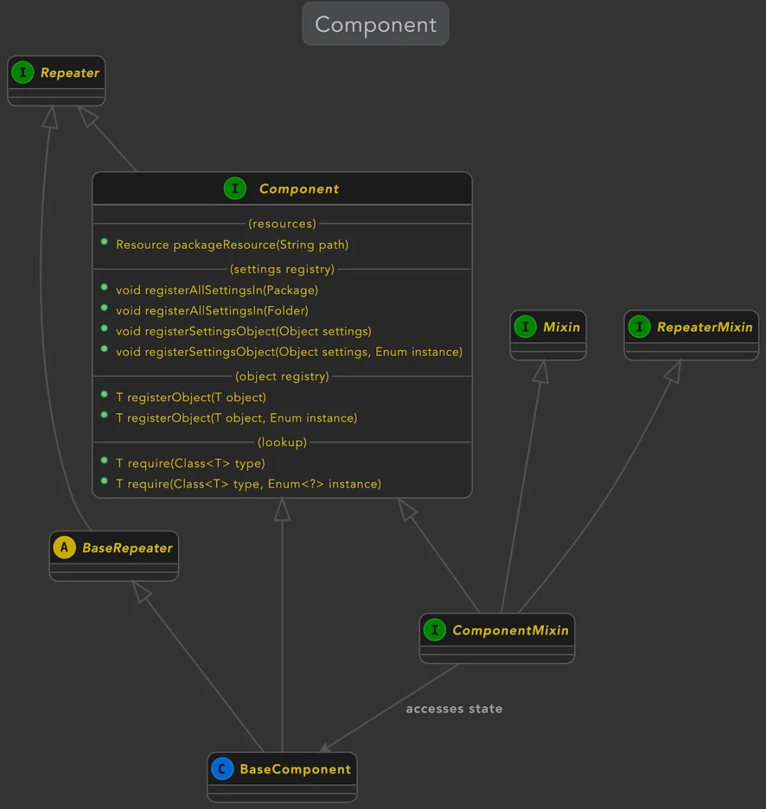 public interface RepeaterMixin extends Repeater, Mixin{@Overridedefault void addListener(Listener listener, Filter<Transmittable> filter){repeater().addListener(listener, filter);}@Overridedefault void removeListener(Listener listener){repeater().removeListener(listener);}[...]default Repeater repeater(){return state(RepeaterMixin.class, BaseRepeater::new);}}