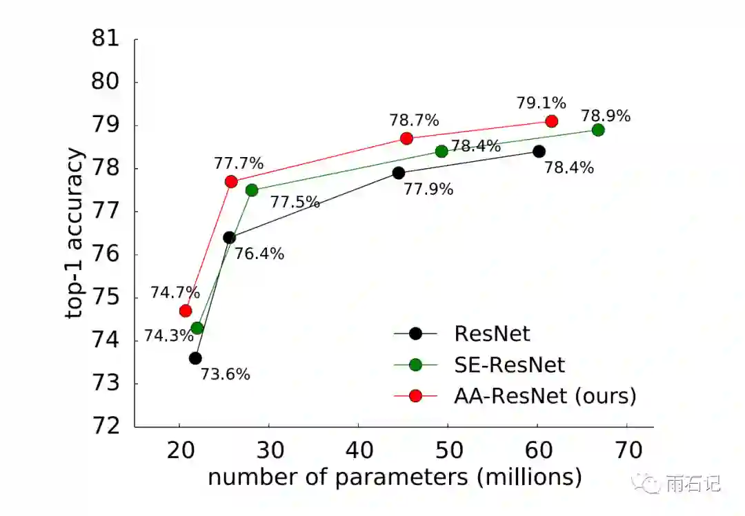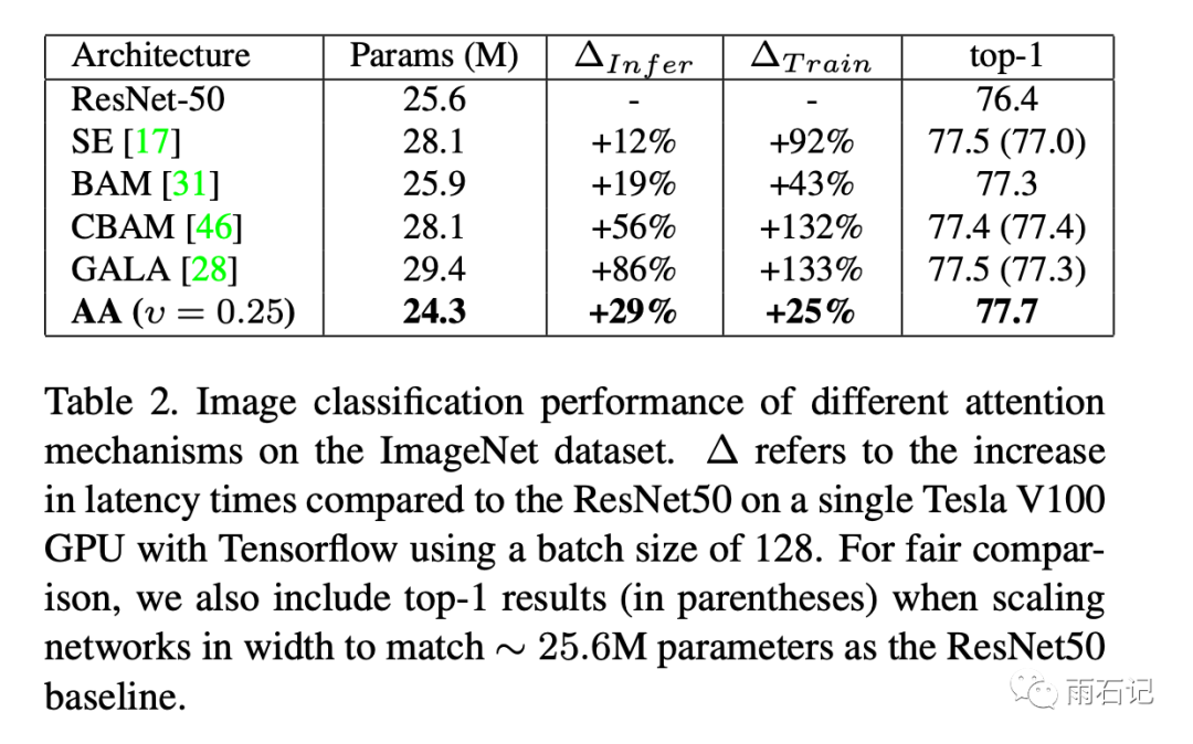 注意力使用8个头,k=2v=0.2,每个头的embedding至少20。同时,还将Squeeze-and-Excitation(SE)和Gather-Excite也进行了实现,结果如下,可以看到注意力增强效果比Excitation方法要好。
