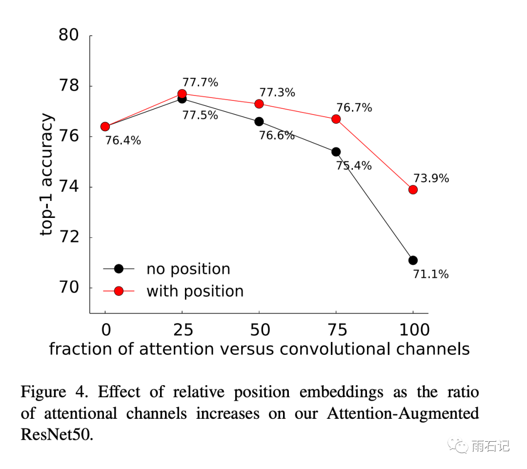 在消融实验中,发现相对位置编码非常重要,如下图,在完全使用注意力的时候,可以提升效果2.8%。