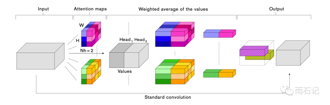 更进一步的,attention引入的参数为Wq, Wk和Wv,所以相当于做了一个1x1的卷积,输入通道为Fin, 输出通道数目为2dk+vv = Fout(2k+v)