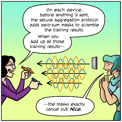 假设 Rakshita 想知道她的朋友 Emily 和 Zheng 听某一首歌曲的频率。Emily 已听过这首歌 SEmily 次,而 Zheng 听过 SZheng 次,但两人均不愿意将数据与 Rakshita 分享,也没有相互分享。因此,这三人可以执行一次安全聚合:Emily 和 Zheng 共同决定一个随机数 M,并对 Rakshita 保密。Emily 告知 Rakshita SEmily + M 的和,而 Zheng 披露 SZheng - M 的差。Rakshita 实际上看到的是两个随机的数字(真实数值 被 M 掩盖),但她可以将这两个数字相加 (SEmily + M) + (SZheng - M) = SEmily + SZheng ,以揭示 Emily 和 Zheng 共同聆听该歌曲的总次数。