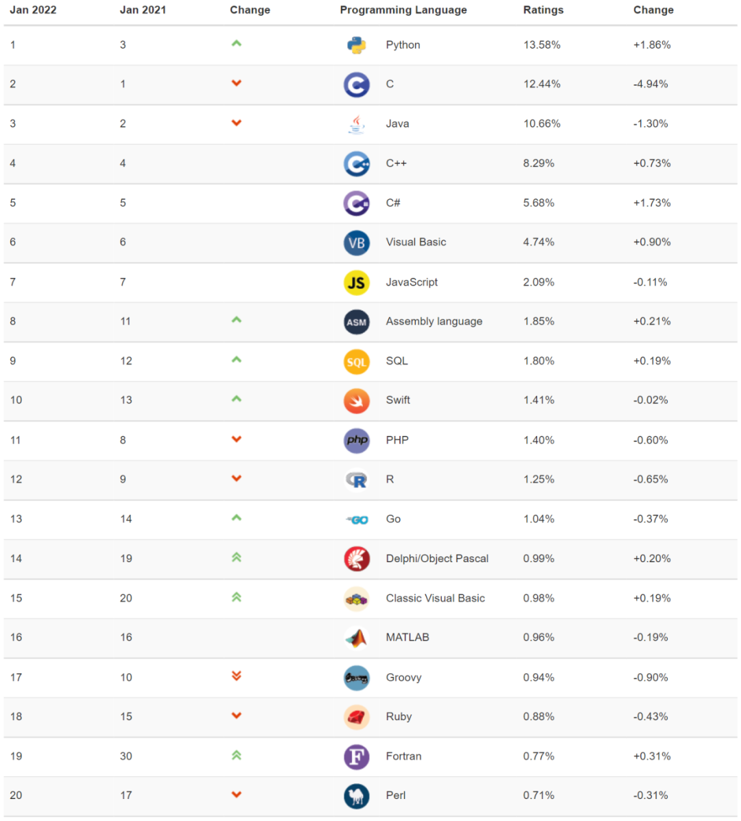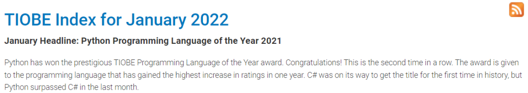 2021 年初,Python 从 TIOBE 指数排行的第三名开始起步,被 Java 和 C 甩在身后。一年之后,Python 成为了 TIOBE 指数排行榜的第一名。